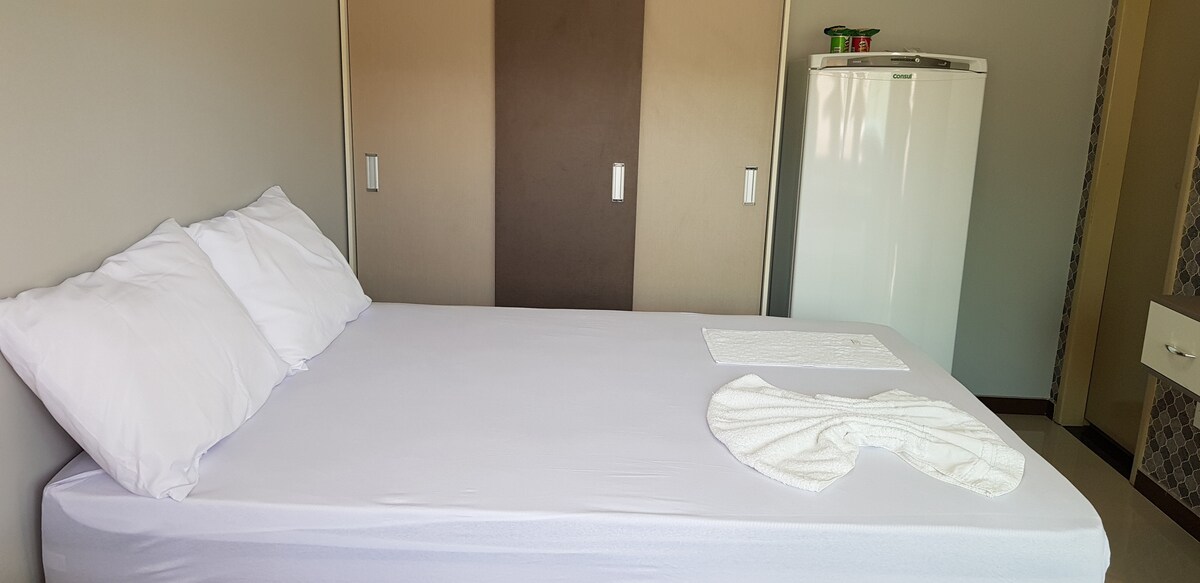 Lugar na may double bed, dagdag na single mattress, unan, sapin sa higaan, tuwalya, tuwalya, aparador, minibar, study bench, electric shower, Wi - Fi, smart TV, paradahan, de - kuryenteng gate, service area na may labahan, air conditioning, balkonahe, puffer, sa tabi ng shopping center ng Jatuarana avenue (mga bangko, ban, meryenda, American store, pizzeria).