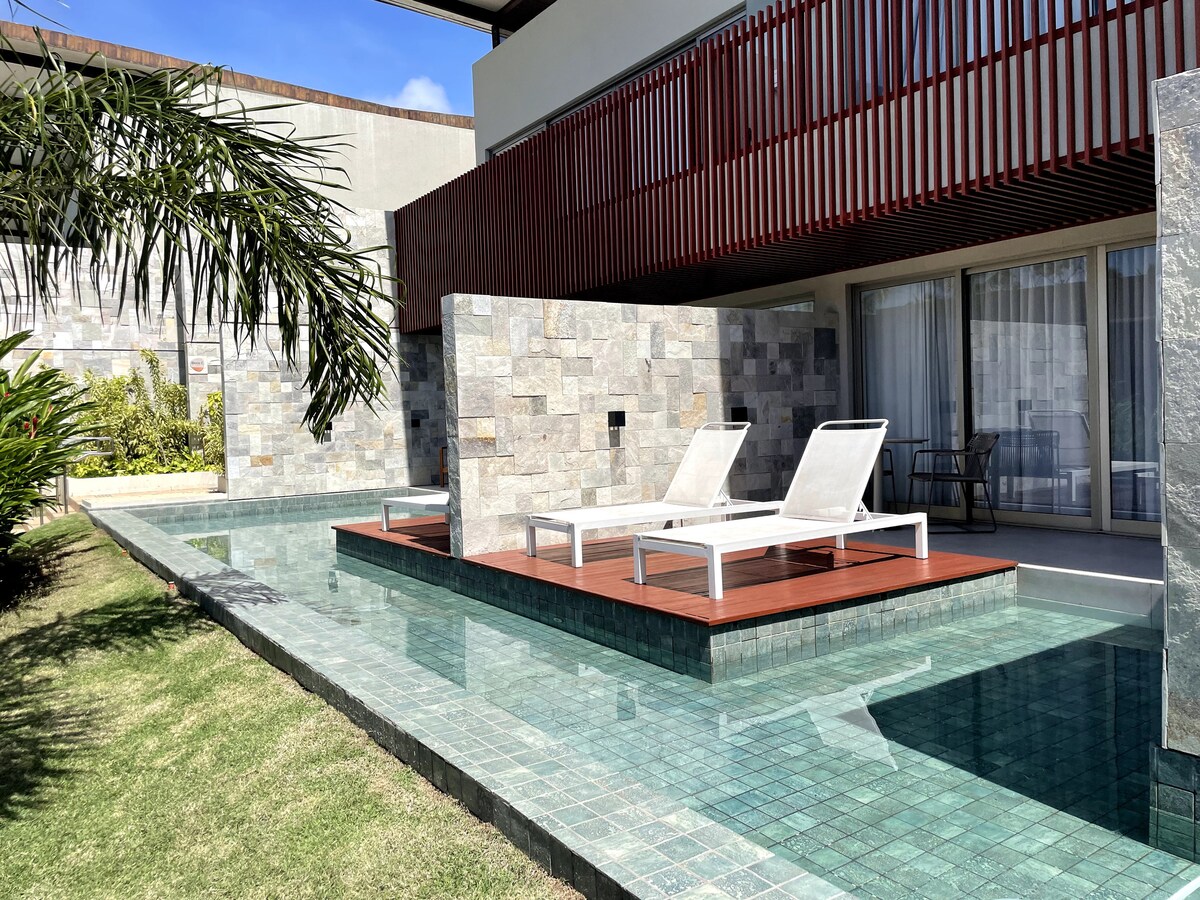 Pinakamahusay na suite para sa honeymoon o pagho - host kasama ang buong pamilya. Walang natutulog sa sahig! isang queen bed + 3 single bed, Lahat ay dinisenyo ng arkitekto, sobrang komportableng accommodation. May laptop countertop at dressing table para mas mapaganda pa ang mga babae. Naka - mirror na wardrobe at Kusina na kumpleto sa Tramontina pinggan at kaldero! Beachfront resort, gym, sauna, restaurant, paglilibang.81986952133