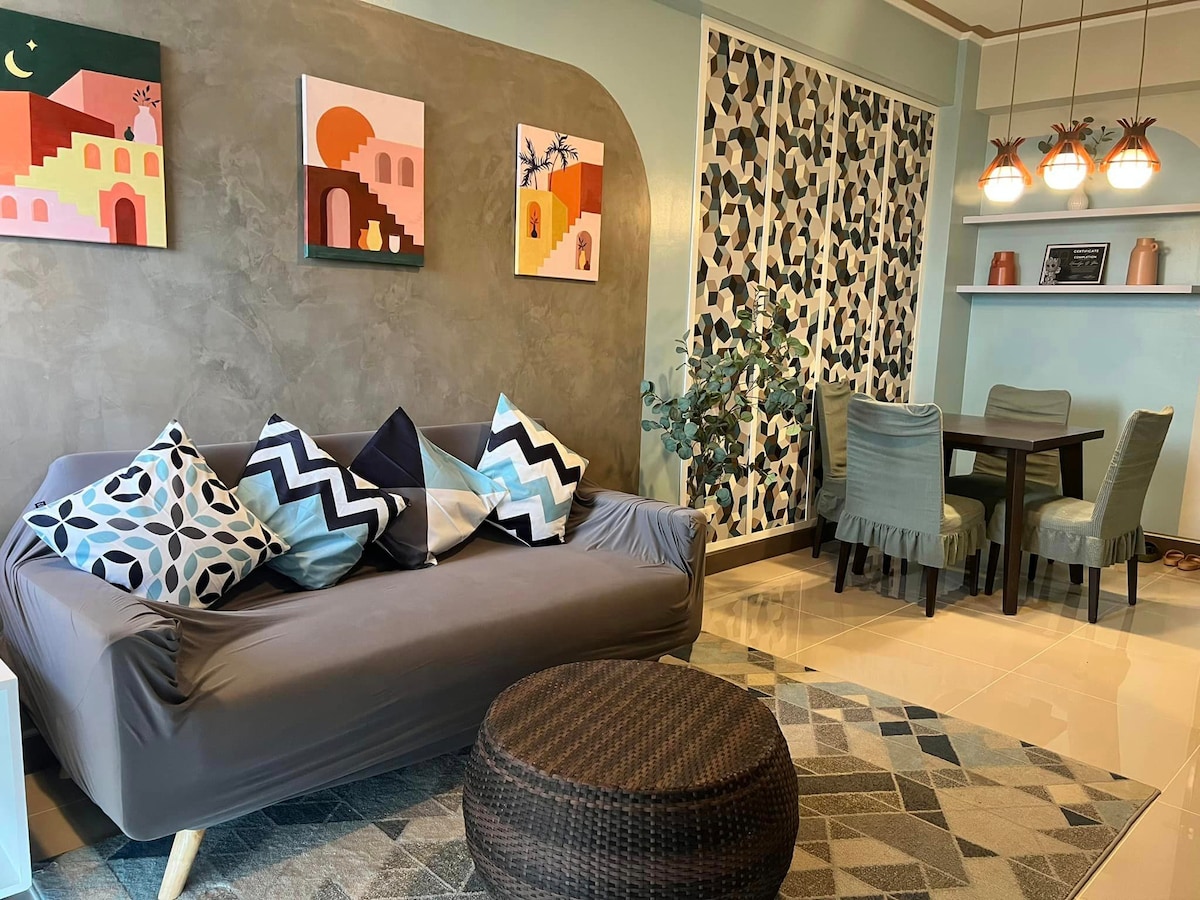 Moroccan - inpired. Modern, naka - istilong, maginhawa, functional at larawan - karapat - dapat na lugar. Mainam para sa mga kaibigan, kapamilya o indibidwal na gustong magtrabaho nang malayuan habang tinatangkilik ang mahabang oras ng staycation. Kumpleto sa kalan ng pagluluto, kagamitan sa kusina, refrigerator, microwave oven, laundry machine, smart TV, 4 - seat dining, balkonahe na may pagsikat ng araw at tanawin ng beach, atbp. Sa pamamagitan ng 24x7 na mga serbisyo sa seguridad at pagtanggap. 1Br condo unit na matatagpuan sa Boracay Newcoast, isang eksklusibong 150 ektaryang township complex malapit sa iconic Keyhole area.