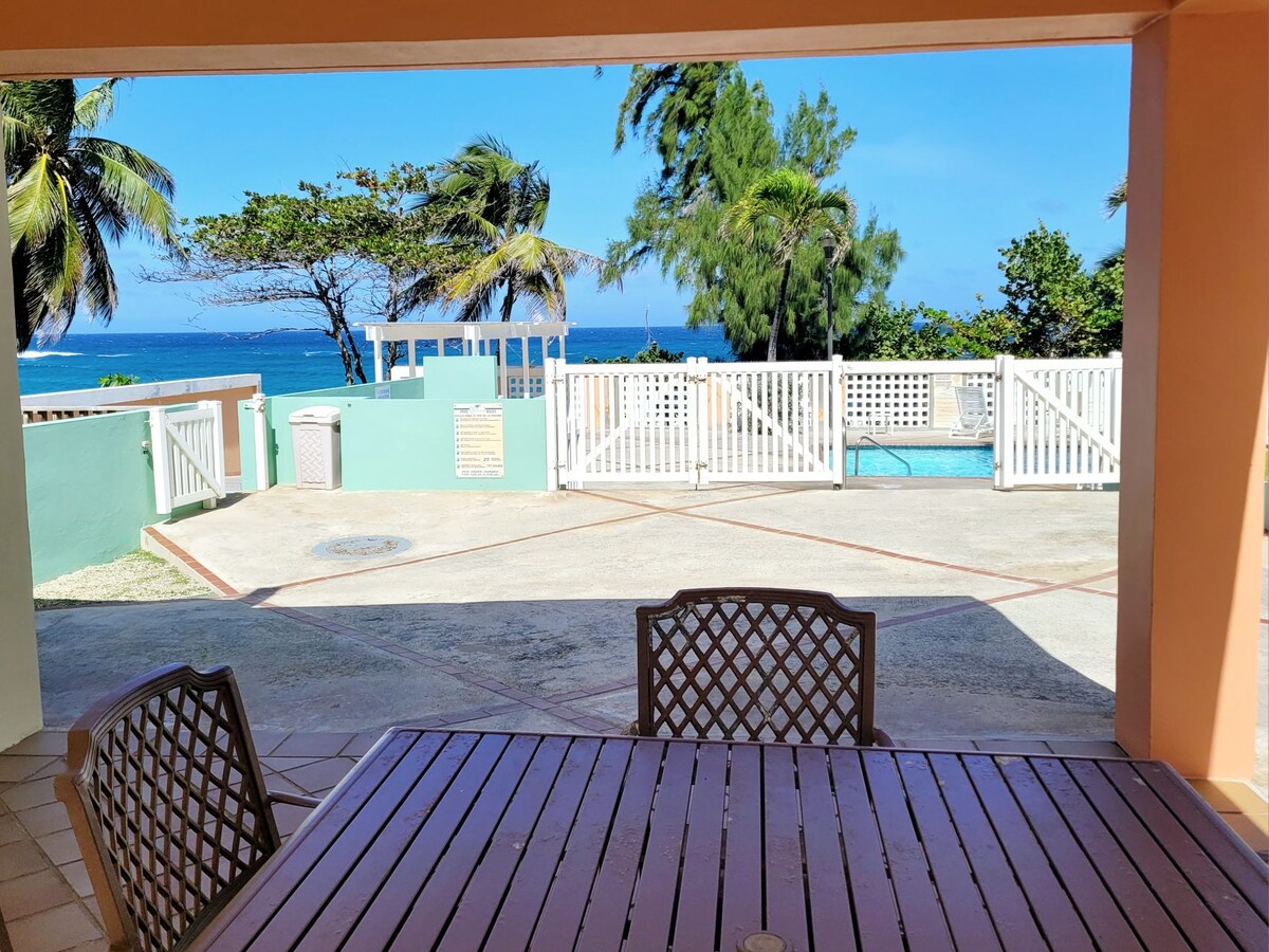 Ang eksklusibong complex na ito sa Rincon, ay isang 2,800 sq. ft, tatlong kuwentong kumpleto sa kagamitan at nilagyan ng Mediterranean style villa na may air conditioning, komportableng kusina, kainan, living room terrace muna at Third floor. May direktang access sa beach ang beachfront villa na ito na may mga batong itinatapon mula sa magandang beach ni Antonio. Isa sa mga pinakamalapit na unit sa beach area