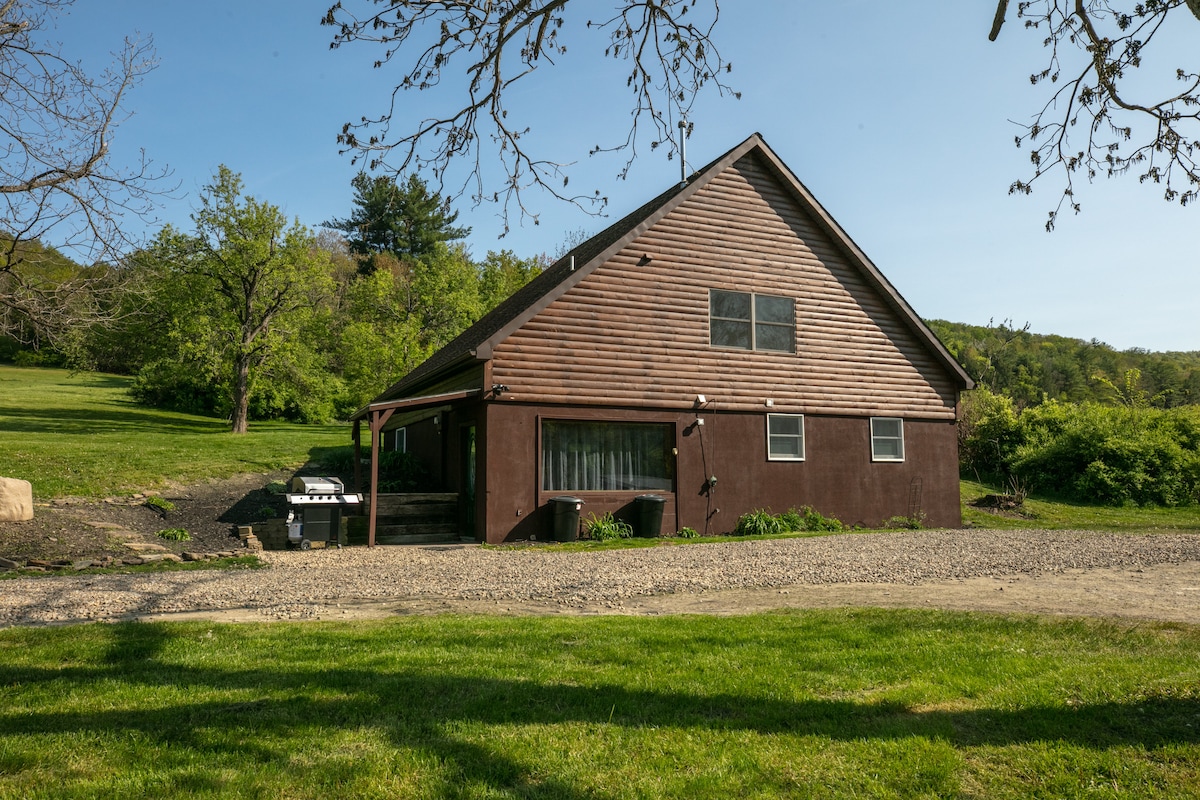 Enjoy this private cabin by a babbling creek. Enjoy your favorite drinks and meals on the covered deck overlooking the hillside and fruit trees. Perfect for singles, couples, families, or small groups. Just 20 minutes from Watkins Glen and 5 minutes from Corning. Wi-Fi, high speed internet, outdoor fire pit, corn hole, fully stocked kitchen, Roku TV, and a large outdoor hot tub!