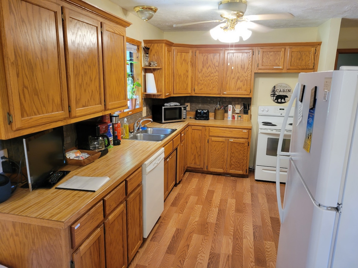 Matatagpuan ang aking studio cabin sa 60 ektarya ng kakahuyan mga 8 milya mula sa Mountain View. Dadalhin ka ng aking mga trail sa paglalakad sa ilang magagandang pormasyon ng bato at paminsan - minsang sulyap sa mga bundok. Pagkatapos ng mahabang lakad na iyon, magkakaroon ka ng dalawang komportableng queen bed na may magagandang unan! May couch, loveseat at recliner, mga libro, TV, pelikula, at kusinang kumpleto ang kagamitan. DISH TV Remote - Pindutin ang power button at pagkatapos ay pindutan ng TV para i - on ang TV. Nasa tuktok na drawer sa ilalim ng tv ang remote para sa DVD player.