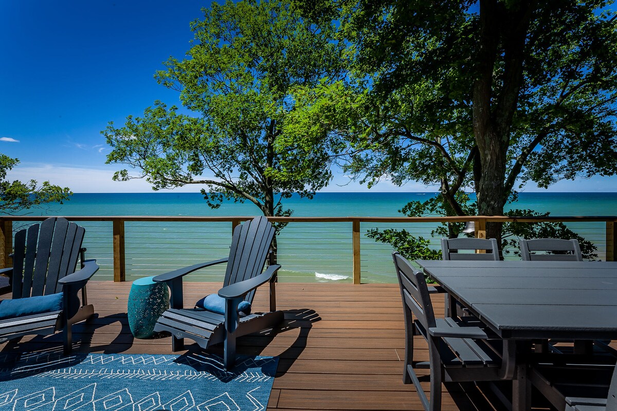 Tumakas sa ganap na inayos na 1,617 talampakang kuwadrado na tuluyan sa tabing - dagat na may 135’ ng pribadong harapan ng Lake Michigan. Masiyahan sa mga nakamamanghang paglubog ng araw mula sa open - concept na kusina o vaulted - ceiling na sala na may malawak na bintana. Sa tag - init, magrelaks sa pribadong beach; sa taglamig, komportable sa tabi ng fireplace pagkatapos humanga sa mga nakamamanghang pormasyon ng yelo. Napapalibutan ng mga puno ng oak, pinagsasama ng tahimik na bakasyunang ito ang mga modernong amenidad na may kagandahan ng kalikasan para sa talagang hindi malilimutang karanasan sa bakasyunan sa buong taon.