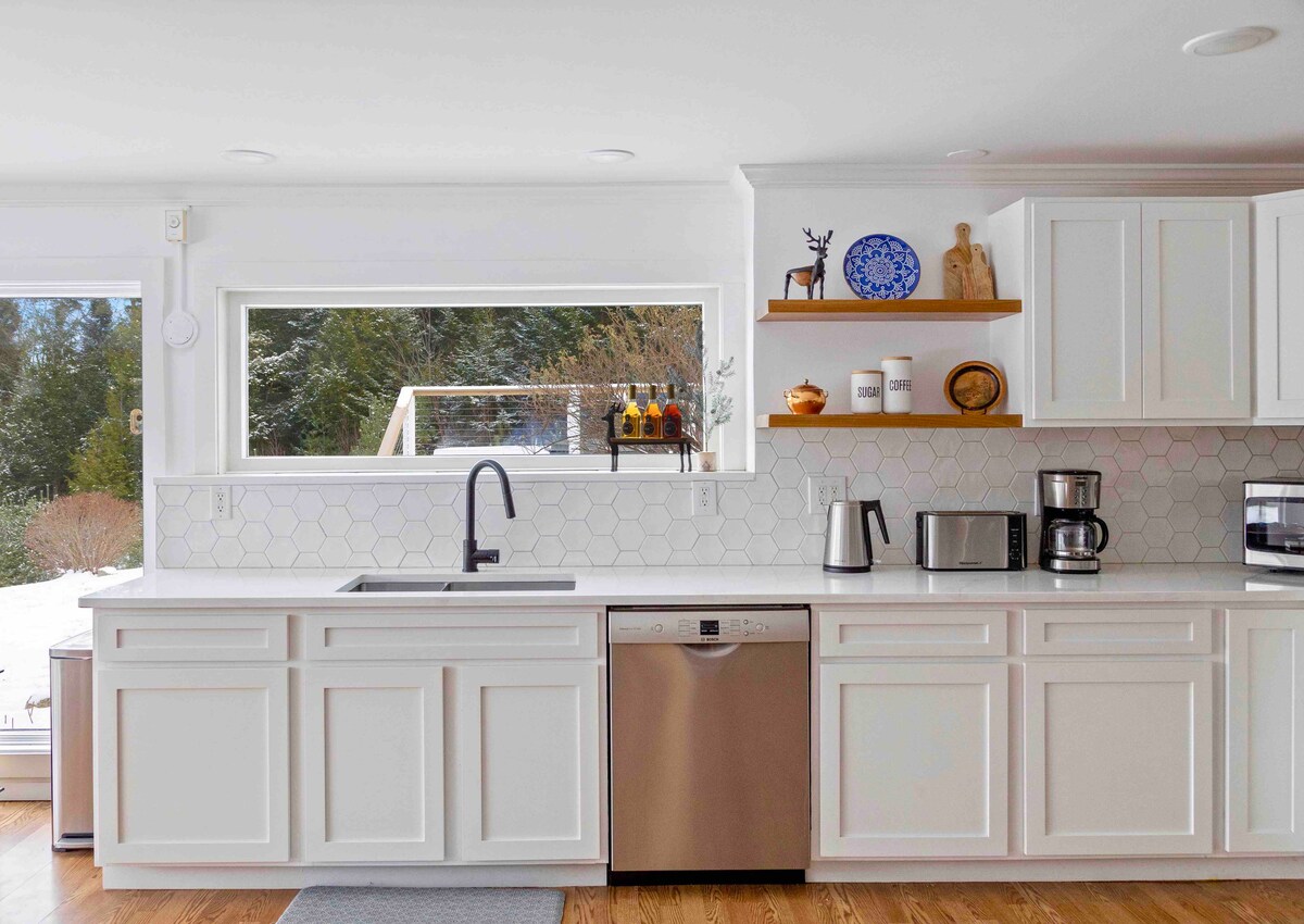 Maligayang pagdating sa The Summit House, isang ganap na inayos na A - Frame cabin na mas mababa sa 1 milya sa downtown Stowe. Magising sa mga tanawin ng liwanag ng umaga sa kagubatan mula sa iyong glass wall bedroom. Magrelaks pagkatapos ng isang araw na pagtuklas sa mga bundok sa malaking spa style rainfall shower. Mamalagi pagkatapos ng hapunan sa paligid ng modernong fireplace na nasusunog sa kahoy habang pinapanood ang iyong mga paboritong palabas sa 50" TV. Ito ay hindi lamang isang upa, ito ay isang karanasan. Ang pinakabagong karagdagan sa koleksyon ng OM Home Residences.