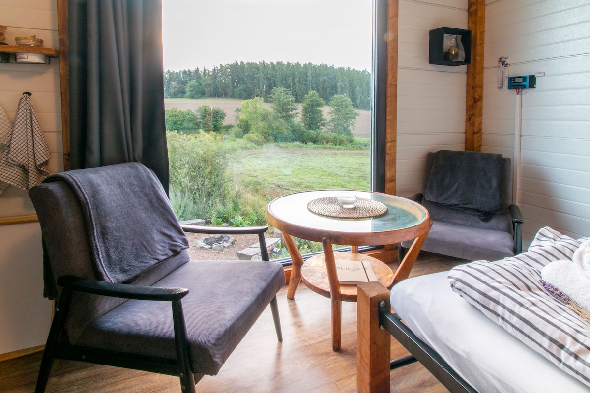 ZIMNÍ REŽIM: V zimních měsících je vypuštěný vodní systém (bez tekoucí vody). K dispozici je pitná voda v kanystrech a vnitřní kempingová tlaková sprcha. Tiny house je vytápěný, vhodný i na zimní pobyt. Ideální pro páry nebo sólo retreat. Tiny house je plně soběstačný – elektřina ze solárů, topení a vaření na plynu. Pokud hledáte netradiční, klidný a vědomý Silvestr, tohle místo je pro vás. Rádi vám pobyt přizpůsobíme a vše předem vysvětlíme.
