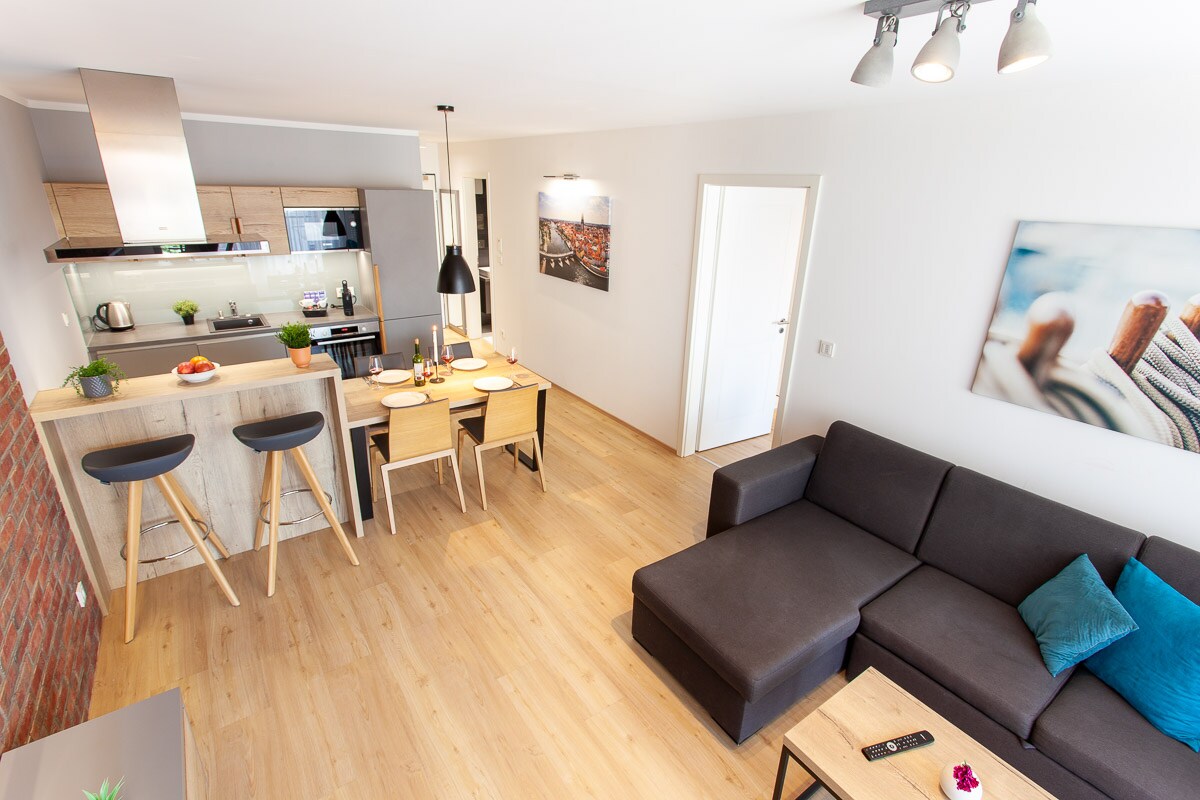 Look forward to a stylish new-build apartment with an open-plan feel and a comfortable double bed. The modern bathroom with floor-level shower gives it a hotel vibe, while the fully equipped kitchen with dining area makes you feel right at home.