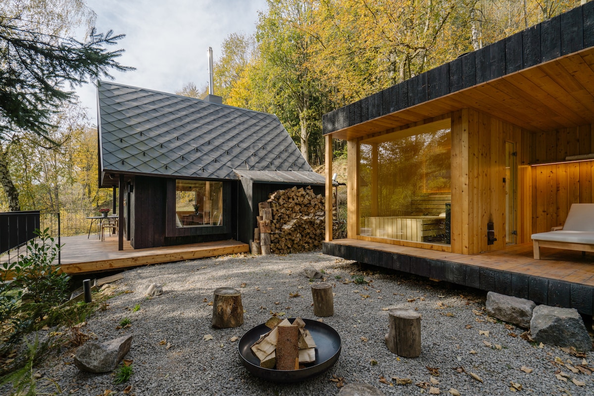 Ang Tré ay isang designer cabin kung saan nakatuon kami sa detalye at kaginhawaan. Puwede kang magrelaks sa pribadong outdoor panoramic wood‑fired sauna. Handa na si Tré para sa pagluluto at paglilinis. Siyempre, may espresso machine (kasama ang kape), Bluetooth Bose speaker, o matataas na American spring bed. May fireplace para sa heating at underfloor heating sa banyo. May libreng paradahan sa mismong ilalim ng cottage.