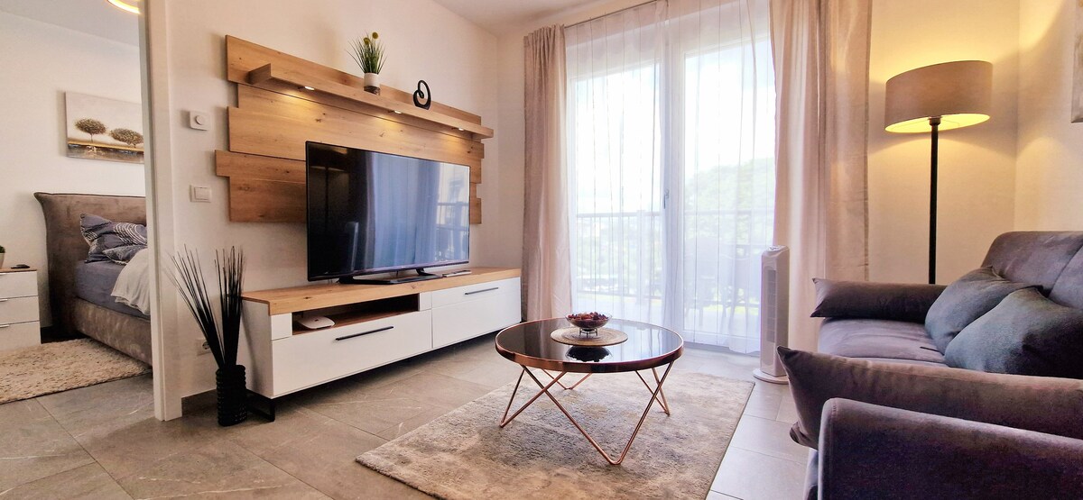 **Apartment na may direktang access sa pool** **Kanan sa South Styrian Wine Route** **Mga hiking trail at daanan ng bisikleta sa labas mismo ng pinto sa harap ** **Infinity Pool, Sauna at Fitness** Ang gusali ay bagong itinayo noong 2022 at isang highlight ng arkitektura sa gitna ng mga ubasan. Ang apartment mismo ay ganap na bago, kumpleto sa kagamitan at may lahat ng kailangan mong maramdaman sa bahay nang mabilis. Ang apartment ay maliwanag at tahimik, ang iyong terrace ay nagdadala sa iyo nang direkta sa kalikasan.
