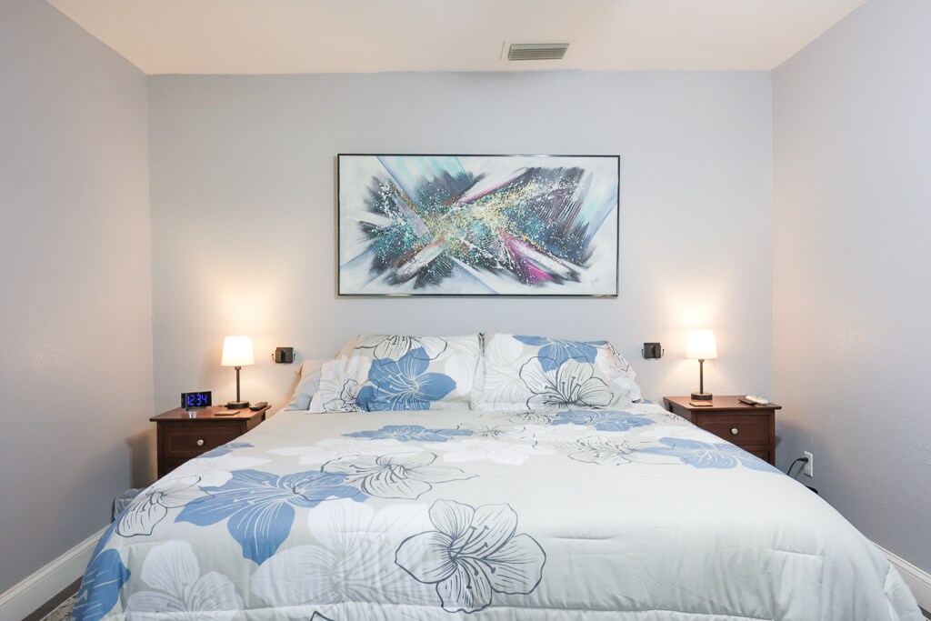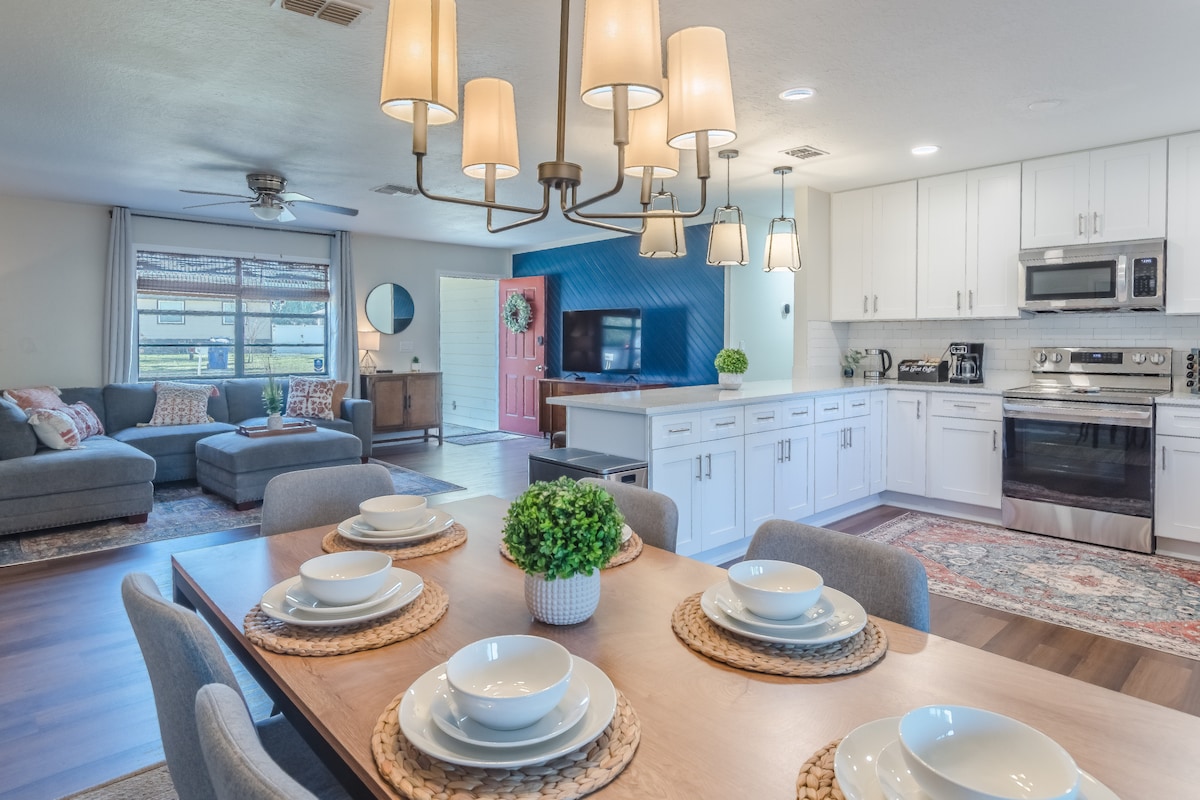 Newly renovated modern villa 3 bed/2 bath cozy home nestled amongst beautiful oak trees and close to Downtown Clermont, National training center, and 35 minutes to Disney World and other major attractions. Home features soft comfy beds including one king, one queen, and two twin beds all with 3" memory foam mattress toppers. The kitchen is fully stocked with spices, coffee/tea station, blender and slow cooker. Game room located in the garage is equipped with foosball and air hockey.