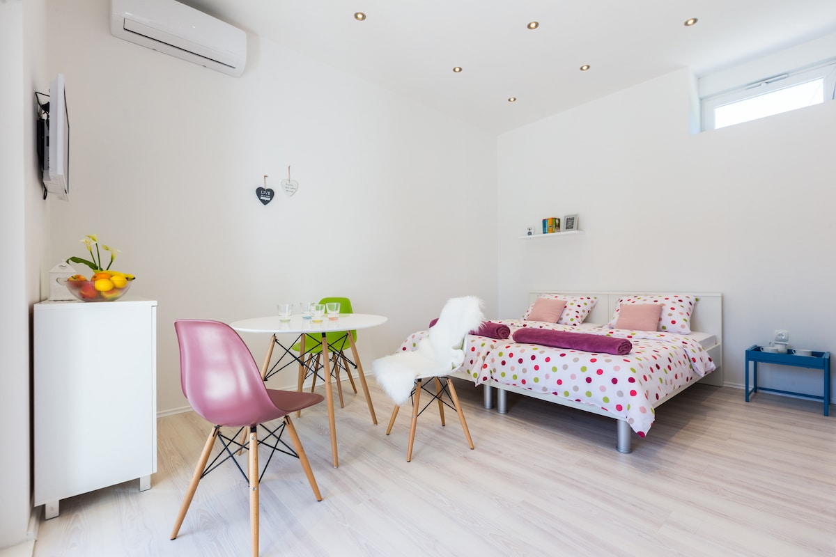 Ang marangyang studio apartment na may kusina, banyo, Tv at air conditioner ay perpekto para sa dalawang tao. Kasama rin ang libreng paradahan. Ang istasyon ng bus, Gaženica port at City Center ay 5min car drive. 300 metro ang layo ng beach mula sa apartment.