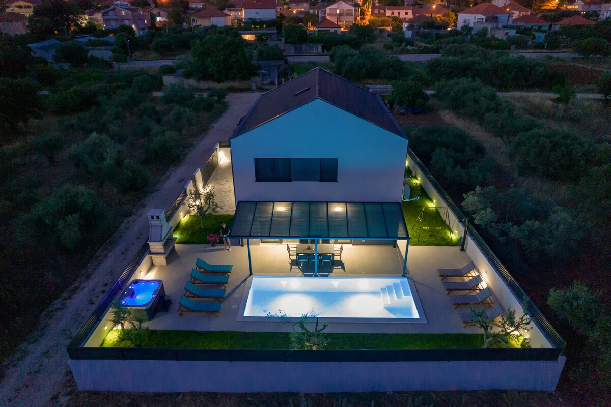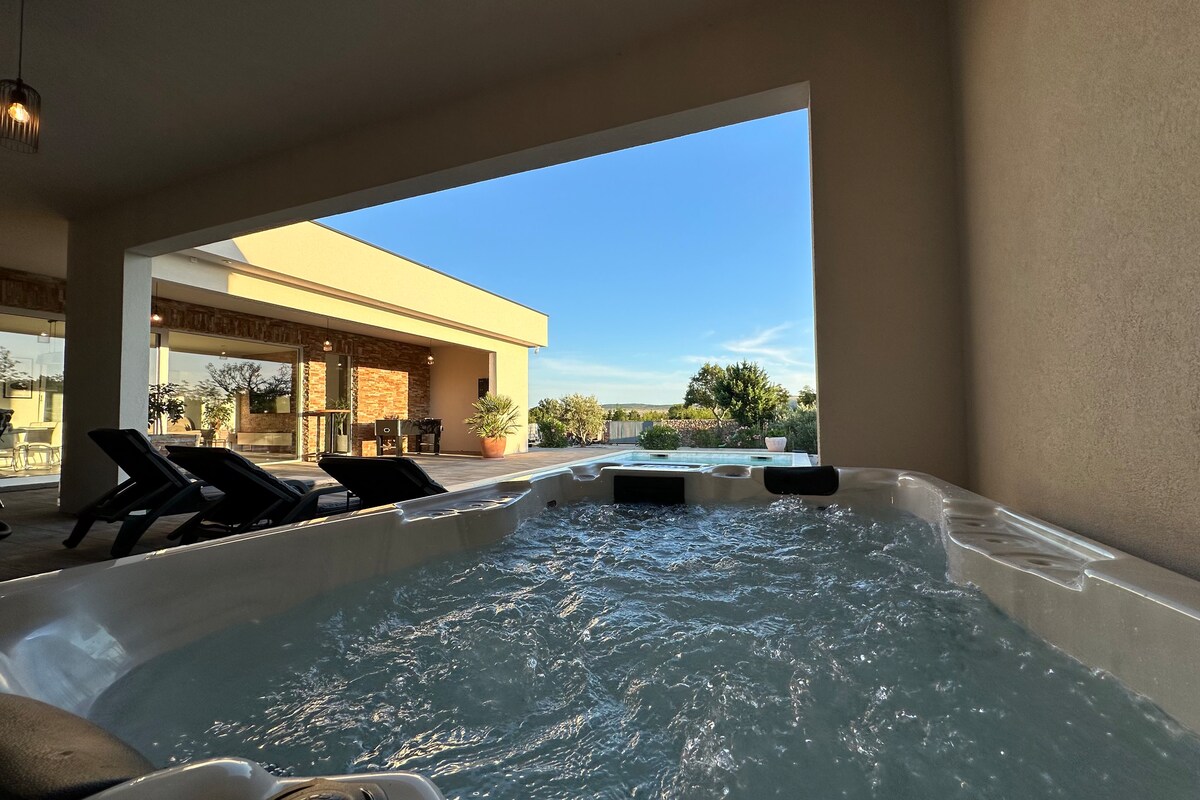 This beautiful villa with heated pool, hot tub and sauna is set on a remote and secluded landscape with a breath-taking view over the valley Heated pool from April to November Great place for relaxing and a starting point for exploring the region and Croatia! City distance Zadar is 28 km (airport 20 km) away Šibenik is 50 km away Split is 125 km (airport 99 km) away Attraction distance Plitvice lakes 125 km away Krka 45 km away Kornati 30 km away