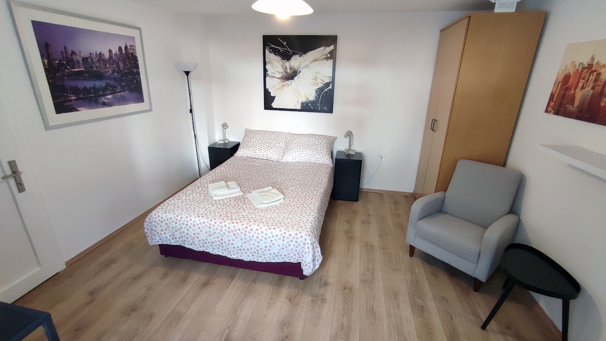 Bumalik at magrelaks sa tahimik at naka - istilong tuluyan na ito. Ang aparment ay bagong ayos at ganap na inayos. Naisip namin ang bawat detalye sa paggawa nito. Bilang isang bisita na inilarawan ang "lahat ng kaginhawaan ng isang tuluyan na may mga kaginhawaan ng isang hotel". Ang silid - tulugan ay maaaring ganap na magdilim. Nangangako ng magandang pahinga ang sobrang komportableng queen bed na may puting satin bedlinen. Ang modernong maliit na banyo ay may lakad sa shower. Pinainit na sahig. Lahat ng tuwalya na nakasuot ng puting koton para sa upscale na pamantayan sa kalinisan. Komportableng sala. Mag - enjoy😉