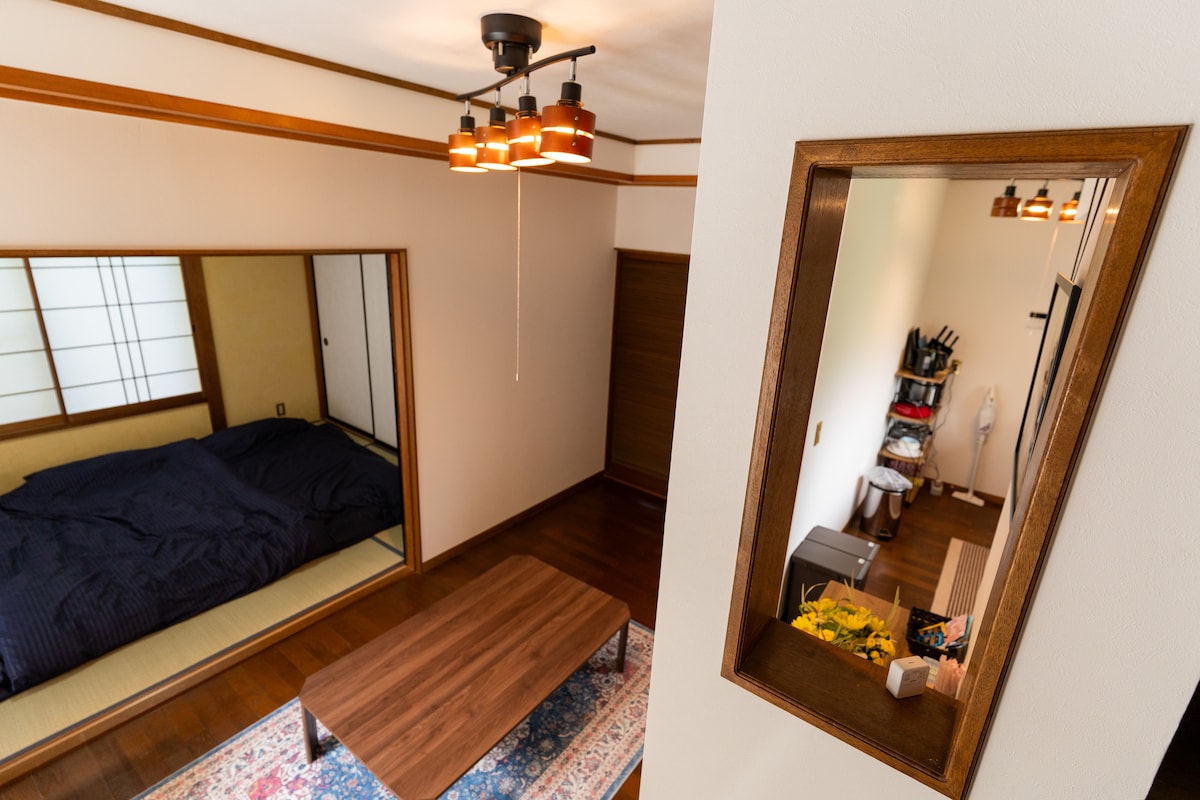 6 na minutong lakad lang ang layo mula sa Susuki Grass Fields, 5 ang komportableng 2LDK na bahay na ito. Pinagsasama nito ang tradisyonal na Japanese at modernong disenyo, na may tatlong futon at dalawang single bed. Magrelaks sa sala na may TV o magbabad sa Komeiseki mineral hot spring bath. Kadalasang walang baitang ang bahay, pero may ilang batong baitang sa pasukan. May malapit na bus stop, convenience store, at golf course. Kasama ang libreng paradahan at EV charger. May mga pangunahing kagamitan sa pagluluto at Nespresso machine sa kusina.