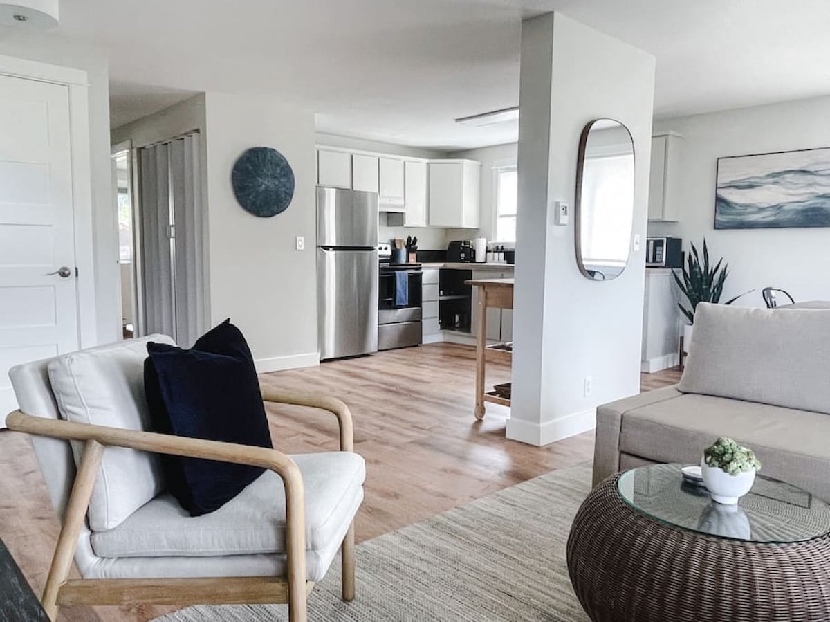 May 17 bintana at 4 skylight ang modernong 900 sq ft na tuluyan na ito na nagbibigay‑liwanag at may magandang tanawin ng mga pine tree na nakapalibot sa tubig. Mag-enjoy sa 2 minutong lakad papunta sa beach at 10 minutong lakad papunta sa Battle Point Park. Magrelaks sa panloob na sauna, mag - enjoy sa sobrang laki ng rain shower gamit ang wand ng kamay. Banyo na may double vanity at radiant floor heating. Mag-enjoy sa pagluluto/pag‑entertain sa kusinang kumpleto sa kagamitan na may malaking island bar, gas cooktop ng chef, double oven, at full‑sized na refrigerator/freezer. Huwag magdala ng maraming gamit! May washer/dryer.