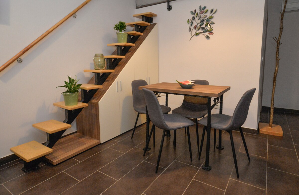 Ang apartment ay may dalawang palapag, na may isang lugar na 54 m2. Sa pangunahing palapag ay may sala na may kusina sa parehong malaking espasyo, banyo at kaakit - akit na balkonahe . Sa itaas ng hagdan, makakakita ka ng romantikong silid - tulugan na may maliit na seating area. Pet friendly kami at tumatanggap ng isang alagang hayop nang walang bayad, ngunit maniningil ng bayad na 5 € bawat araw para sa bawat karagdagang alagang hayop sa unang pagkakataon.
