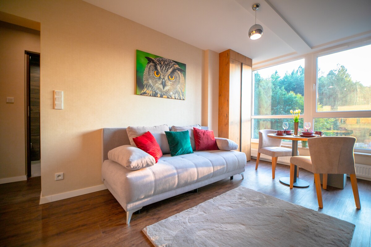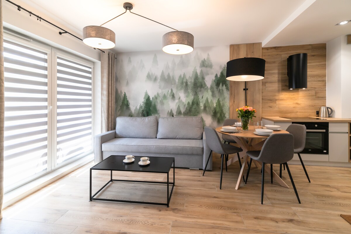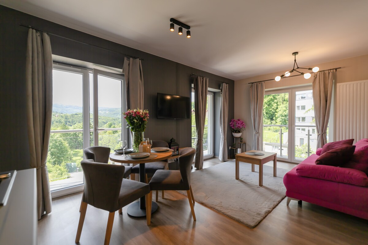 APARTMENT 1 (4-6 na may sapat na gulang + 2 bata) 90 sqm Malaking apartment sa pinakataas na palapag ng gusali. Magbibigay ng di-malilimutang karanasan ang timog, halos salaming pader at tanawin kung saan matatanaw ang mga bundok at ski jump. Ang apartment ay binubuo ng isang napakalawak na espasyo na binubuo ng isang sala, silid-kainan at kusina. Bukod pa rito, may 2 hiwalay na kuwarto na may mga double bed at maliit na kuwarto para sa mga bata na may bunk bed para sa 2 bata. May kasamang sauna sa gusali