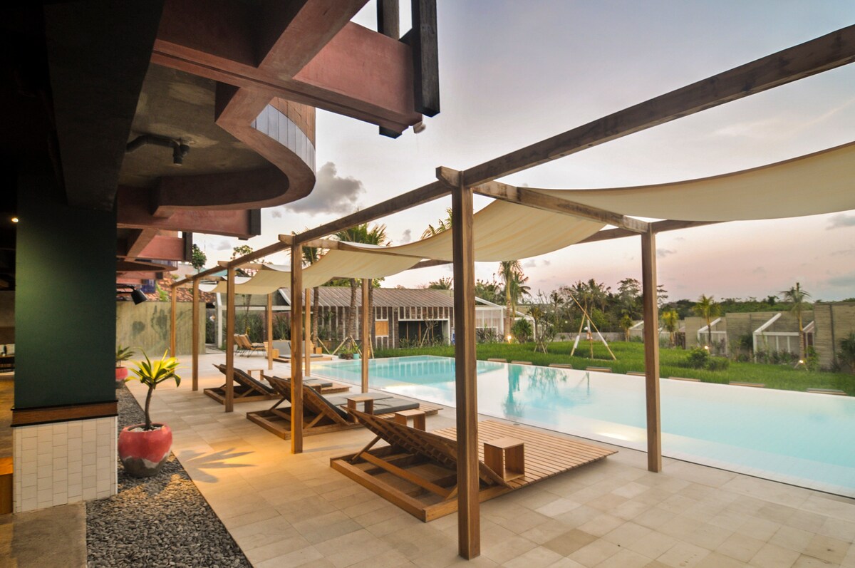 Matatagpuan sa ibabaw ng mga terasang taniman ng palay at may tanawin ng karagatan, 3 minuto lang ang layo sa malinis na beach, at pinagsasama‑sama ng idinisenyong villa na ito ang kalikasan at modernong kaginhawa. Mag‑enjoy sa infinity pool, pink na paglubog ng araw, at mga alon. May kumpletong kusina, malaking hapag‑kainan, maraming common area, king‑size na higaan, pool table, mga laro, 52" na SmartTV, fiber Wi‑Fi, at workspace kaya perpekto ito para sa mga pamilya, grupo ng mga kaibigan, o bakasyon. Mag‑enjoy sa mga pagkain at masahe sa tahanan sa isang tahimik at awtentikong bahagi ng Bali