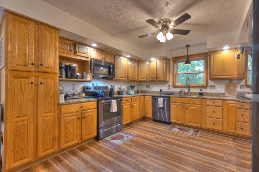 Walang patakaran para sa mga alagang hayop. Mainfloor KING Size Bed "Capt. Qtrs" w/deep Soaking Tub 'en Suite!❤️Malawak na Hagdanan (Hindi Spiral!) Sa itaas ng Q.Bdrm.(#2) komportableng Higaan.+Bdrm.(#3) w/two single Beds Youth/Kids. Malinis, naka - istilong at komportableng dekorasyon. Hall 2nd BATH Shower.(Central Heat,A/C) Labahan. Wifi Satell. 1 SmartTV(Hulu,Amaz), dvds, mga laro. 3 couch. Well equip. Kusina. Propane BBq. Bench Deck Pribadong upuan. Panlabas na kahoy na FirePit. .5 milya. Baxter Boat Public Launch& Dogwood Cyn. Walang cabin sa tabi, kaya lahat ng Bdms = tanawin ng puno!😍