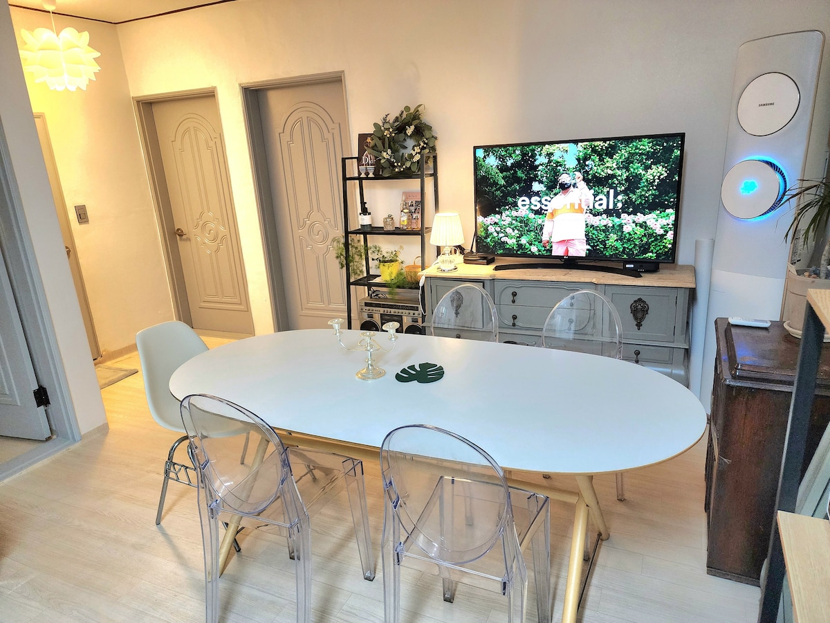 * * Escondite Escondite: 🧚🏻♀️Isang lugar na dapat itago kapag naglalaro ng taguan at naghahanap.,,** 💕Insta: Maghanap sa pamamagitan ng ‘Escondite’ Maaari ka ring makipag - ugnayan sa DM.💕 💕 Matatagpuan ito sa Dal - dong, ang pinaka - downtown area sa Ulsan.💕 May mga maiinit na lugar sa lahat ng lugar na puwede mong lakarin! Tahimik ang tindahan, pero tahimik ang bahay.🧚🏻♀️ * May sunod - sunod na diskuwento sa pamamalagi (unang pagtatanong ^^) * Maluwag na sala at dalawang independiyenteng silid - tulugan : Queen size bed * Ang maximum na kapasidad ay 6 na tao ^^ Kung magbu - book ka ng higit sa 4 na tao, magse - set up kami ng stopper ng kutson. * Kalmado sa loob batay sa kahoy Beam projector at Netflix DisneyPlus YouTube. Malaking kahoy na mesa na 2 metro. Maaari kang magkaroon ng komportable at eleganteng pahinga na may berdeng interior ng plano~ * Hindi pinapayagan ang pagluluto. (Kung mananatili ka nang matagal o may anumang espesyal na sitwasyon, pakisabi sa amin ^^) Kung maglalakad ka ng ilang hakbang, maraming restawran ^^ Ang paghahatid ng pagkain ay inorder din nang huli + mabilis na dumating~ * Pero! Mayroon kaming iba 't ibang mangkok at baso para sa pagse - set up ng magandang mesa. (Seryosong host para sa pagtatakda ng mesa ^^)