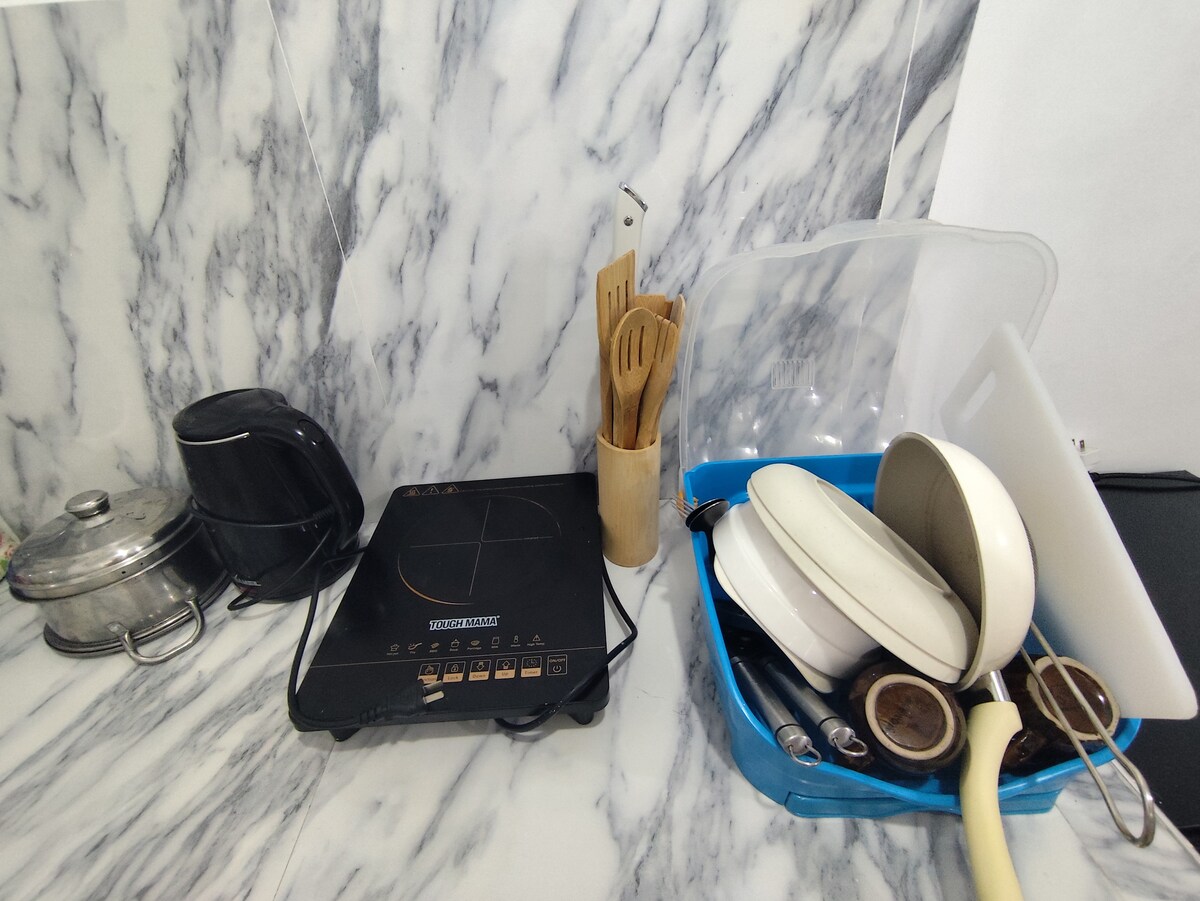 Isang komportableng bakasyunan malapit sa gitna ng lungsod, na perpekto para sa mga solong biyahero o dalawang bisita. Nagtatampok ang tuluyan ng komportableng full - sized na higaan (54" x 75") at maliit na kusina para sa magaan na pagkain. Ang minimalist na disenyo at pagpapatahimik ng mga neutral ay lumilikha ng mapayapang vibe. Tandaang may rooftop resto-bar sa itaas na may live acoustic music sa gabi at ilang ingay sa kalye sa araw, pero mainam pa rin ito dahil kumportable ito at madali kang makakapunta sa lungsod.