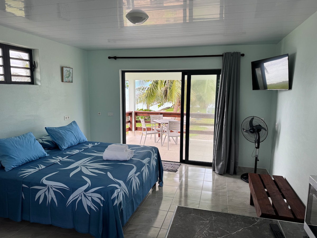 Independent duplex bungalow, beachfront, na matatagpuan sa pribadong ari - arian. 1 naka - air condition na kuwartong may 1 malaking double bed + 1 sofa bed. Isang kusina at paliguan. Panlabas na pribadong terrace sa hardin sa aplaya. Available ang 2 kayak para ma - access ang sandbank na 100 metro mula sa faré at sa Taapuna surf spot, 800 metro ang layo. International /interisland airport 10 minuto sa pamamagitan ng kotse. Bukas ang supermarket nang 24 na oras sa 10 minutong lakad. Mga kalapit na restawran, meryenda at trailer.
