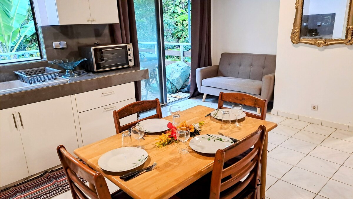 Kumportable at ligtas na bungalow kabilang ang silid - tulugan, 1 banyo, 1 kusinang kumpleto sa kagamitan at 1 natatakpan na terrace sa isang pribadong property kung saan kami nakatira. Matatagpuan 5 minuto mula sa FAAA airport at malapit sa lahat ng amenities (mga tindahan, pampublikong transportasyon, parmasya at pag - arkila ng kotse).