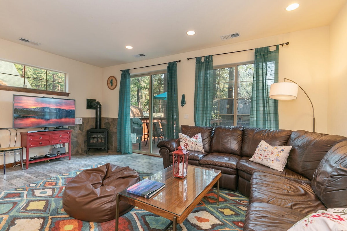 MALAKING Maluwang na Cabin - 2200 talampakan - napapalibutan ng Pambansang Kagubatan. Maganda ang layout at nararamdaman ng kisame ng kahoy na may vault na parang nasa tree house ka. May malaking kuwarto para sa yoga (may mga mat), Peloton bike, at massage chair. MGA daanan ng PAGHAIKING AT PAGBIBISIKLETA (snowshoeing at cross country skiing) at isang KAMANGHA-MANGHANG SLED HILL at nasa labas lang ng aking pinto. Gayunpaman, 2 milya lang ang layo mo sa Beach; 6 na milya mula sa Northstar Ski Resort. 343 mbps ang bilis ng internet sa pag-upload/pag-download kada test.