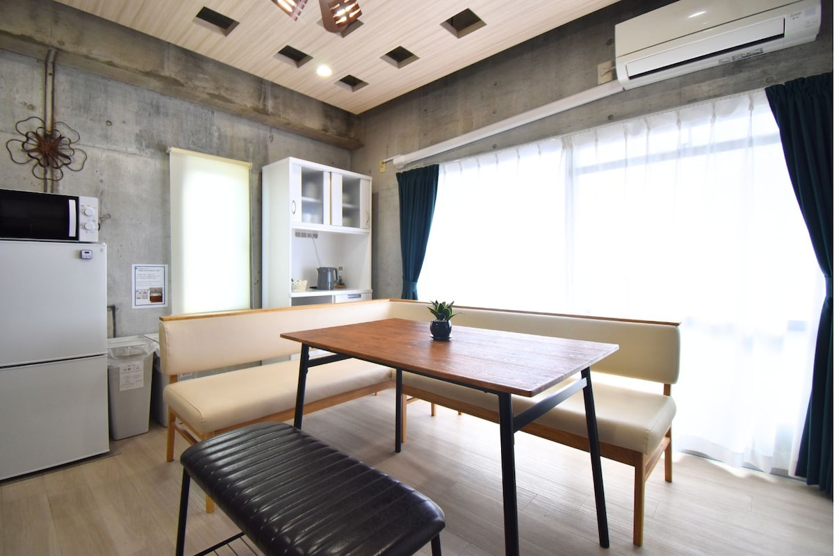 Matatagpuan ang kuwartong ito sa ikalawang palapag ng dalawang palapag na gusali. May pasukan at shower room sa unang palapag, at may restawran na hiwalay sa pasukan. Siyempre, puwede mo itong gamitin bilang lugar na matutuluyan para sa pagbibiyahe, pero naisip namin kung paano gumawa ng mga muwebles at lugar para makapagpahinga ka at ma - enjoy mo ang pasilidad na ito. Sa silid - kainan na may kusina sa isla, masisiyahan ka sa musika sa pamamagitan ng mga de - kalidad na speaker. Masiyahan sa pabango at texture ng pambihirang pine flooring ngayon. Tungkol sa lugar ng silid - tulugan, isipin ang tungkol sa maliliit na bata, at maghanda ng makapal na futon sa halip na higaan.Bilang karagdagan, ang futon area ay isang maliit na pagtaas ng tatami mats. Ito ay isa sa mga pinakamalapit na pasilidad ng tirahan sa Uno Station, at may mahusay na access sa mga malalayong isla tulad ng Naoshima. Malapit din ang mga convenience store at sikat na restawran. Available ang Ingles.