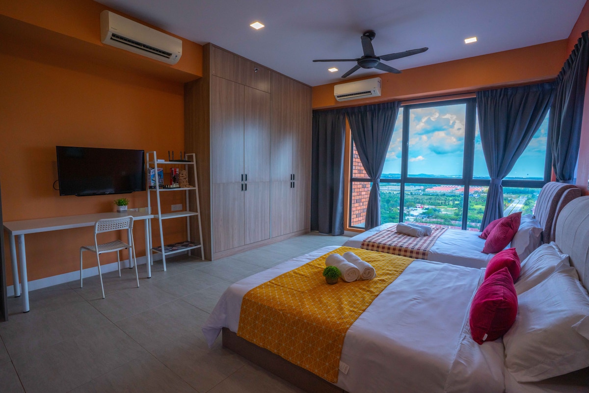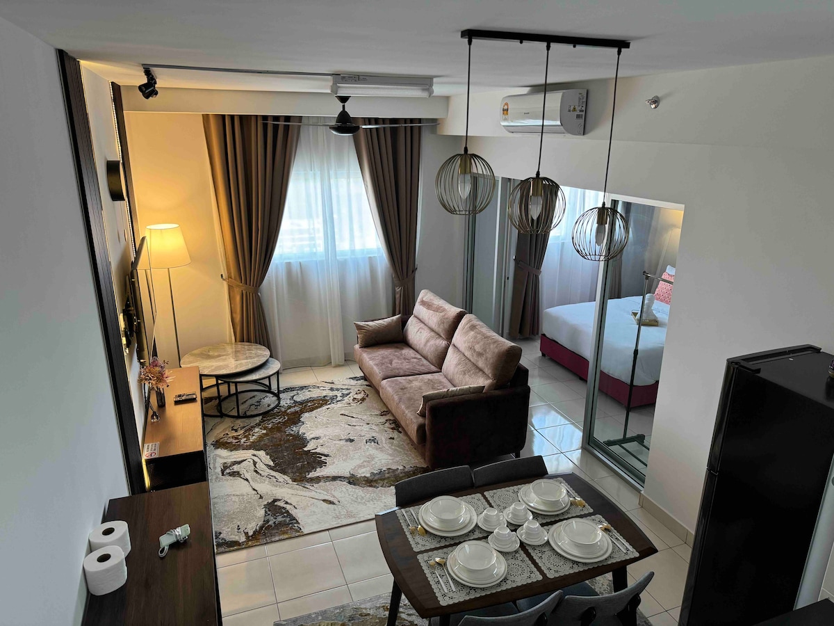 I - explore ang aming komportableng studio, na puwedeng tumanggap ng 2 hanggang 3 tao na may queen bed at sofa bed. 15 minutong biyahe lang ang layo mula sa KLIA T1/T2, napapalibutan ang lugar ng maraming restawran, sanga ng fast food, pamilihan, at labahan. Tangkilikin ang lahat ng amenidad, kabilang ang palaruan ng mga bata, BBQ area, gym, at swimming pool, nang may 24/7 na seguridad. * Hindi available ang iyong bagahe bago ang oras ng pag - check in. Dahil sa disenyo ng gusali, kailangang maglakad ng 10 baitang na hagdan para makakuha ng elevator.