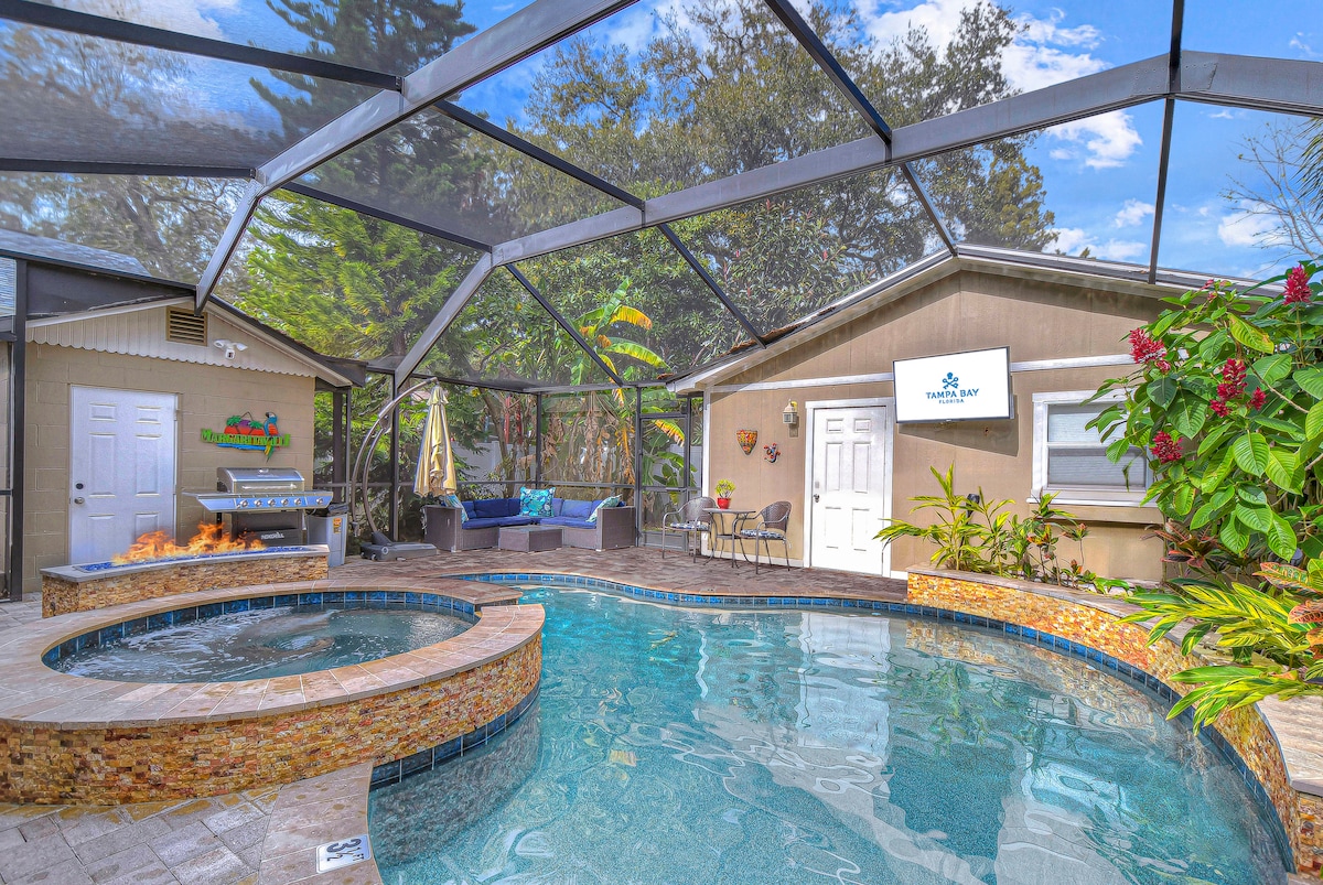 Tampa Oasis - 3Br/2BA(Half Bath na may shower sa labas na may mainit na tubig), Heated Pool, at Hot Tub (Saltwater) Maligayang pagdating sa kaginhawaan at pagrerelaks malapit sa Tampa Airport! Ang 3 - bed, 2 bath home na ito ay komportableng natutulog sa 8 na may pullout bed. Masiyahan sa pinainit na pool, hot tub, at shower sa labas + TV. Malapit sa paliparan, mga atraksyon sa Tampa, at marami pang iba. Kasama sa mga amenidad ang Wi - Fi, washer/dryer, at smart home tech. Mag - book na para sa hindi malilimutang pamamalagi sa Tampa!