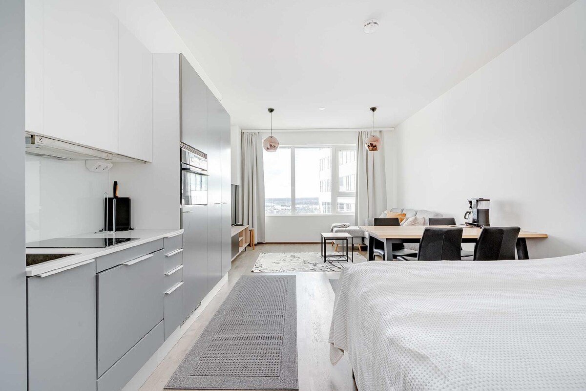 Tangkilikin ang nakamamanghang tanawin sa isang magandang lokasyon. Ang maluwag at eleganteng pinalamutian na studio ay nagdudulot ng kamangha - manghang tanawin at katahimikan upang matiyak ang matagumpay na biyahe. - Lokasyon sa tabi mismo ng Nokia Arena - Malapit sa istasyon ng tren, istasyon ng bus, unibersidad, Technopolis at mga lugar ng gig - paglalakad papunta sa pamimili at mga restawran - Kahanga - hangang tanawin sa sentro ng Tampere - Naka - istilong at modernong pinalamutian na apartment