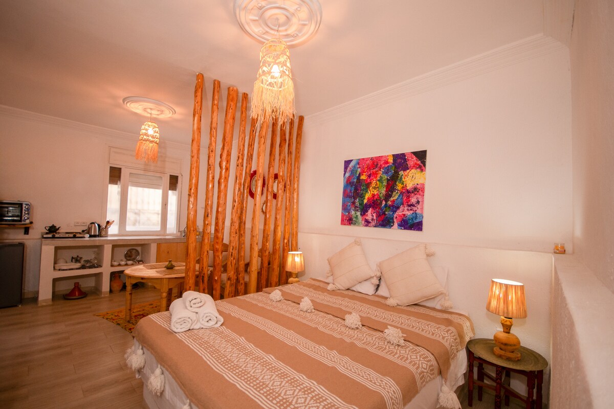 Matatagpuan ang aming bahay sa gitna ng masiglang sentro sa isa sa mga pangunahing kalye ng Tamraght. Malapit lang ang lahat ng kailangan mo: mga latte art café at restaurant, mga supermarket at tindahan, at lingguhang pamilihan. Puwede kang maglakad papunta sa beach sa loob lang ng 10 minuto. Ang pinakamagandang tampok ng apartment ay ang fireplace, pati na rin ang kahanga‑hangang roof terrace na may 360° na tanawin ng dagat, mga puno ng argan, at nayon.