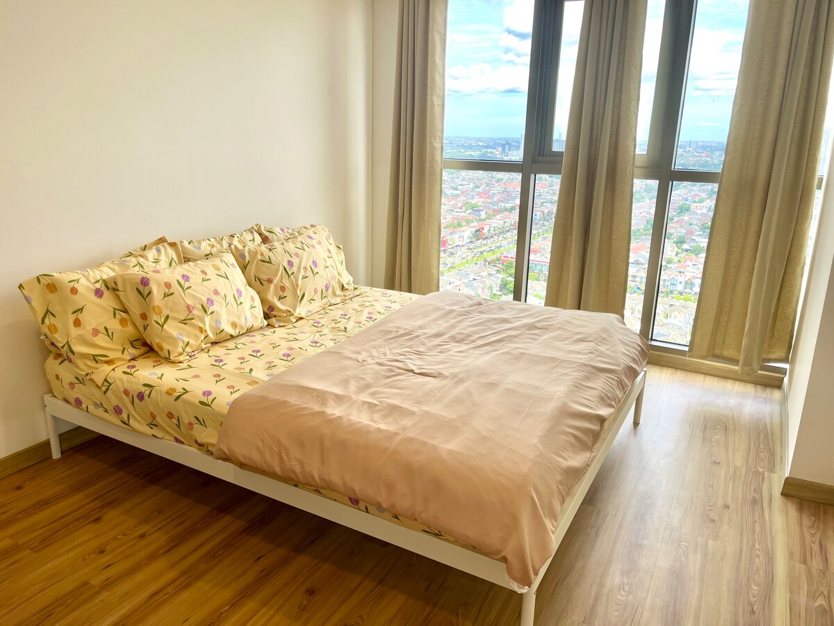 Matatagpuan sa Roseville tower, ang maluwang na duplex na ito ay isa sa mga pinaka - marangyang apartment sa BSD. Nag - aalok ang 95sqm unit ng mga kontemporaryong amenidad kabilang ang kusina, 100mbps WiFi, 75 - in TV, at desk na may malawak na skyline view. Matatagpuan ito sa CBD, malapit lang ito sa mga restawran, bangko, at mall ng Teras Kota, at ilang minutong biyahe papunta sa The Breeze, AEON mall, ICE. Masisiyahan din ang mga bisita sa Olympic - size na swimming pool, lounge na may billiard table, gym, minimart, daycare at laundromat.