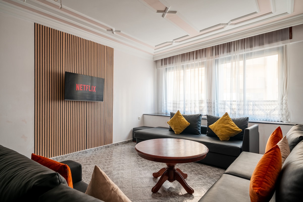 PLEASE READ BEFORE BOOKING For a unique stay in Tangier, we offer you this modern apartment, with stylish living room and balcony. Sleep well on memory-foam pillows and hypoallergenic bedding. Quiet A/C, strong Wi-Fi, fully equipped kitchen, washer. 65″ QLED TV for movies and sports. Secure entry and elevator. Walk to cafés, shops, and the Medina. to ensure a healthy and relaxing environment. Important note: The apartment is intended only for families, married couples, or same-gender friends.