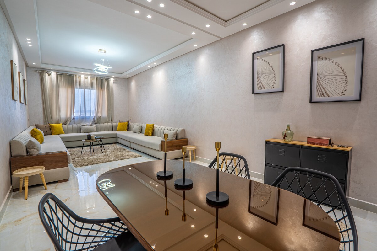 Ashraf Home offers you an exceptional stay in a modern and refined apart in a private and secure residence. The apartment, recently tastefully furnished, guarantees you premium services for optimal comfort. Close to all the amenities of the superb locality of Tangier.(Beaches, Shops, Cafes... etc) Location 8-minutes from Airport and 11-mnt to the town, 5-mnt Achakar beach🌊. two spacious living rooms 🛋️☕️ equipped kitchen🍽️ and two elegant bedrooms🛏️🛌. Book now for unforgettable moments! 🎉