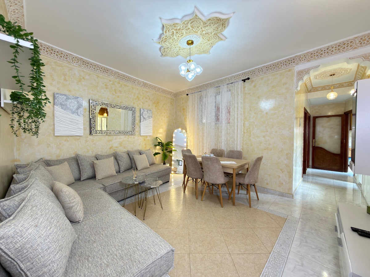 Mamalagi sa beachfront at sa gitna ng downtown sa maluwang na apartment na ito na may 3 kuwarto, tanawin ng dagat, pribadong garahe, at magandang lokasyon sa Marina Bay Corniche ng Tangier. Ang magugustuhan mo: • May direktang access sa mga promenade ng Corniche. • 135 m² ng dalisay na kaginhawaan • Mabilis na Wi - Fi at Smart TV • Pribadong garahe (bihira sa lugar na ito!) • Kusina na kumpleto ang kagamitan • Madaling access sa mga taxi at pampublikong transportasyon Nakakapagbigay ng ganap na karanasan sa pamumuhay sa Tangier ang apartment, na perpekto para sa mga pamilya at magkakaibigan na gustong tuklasin ang lungsod.