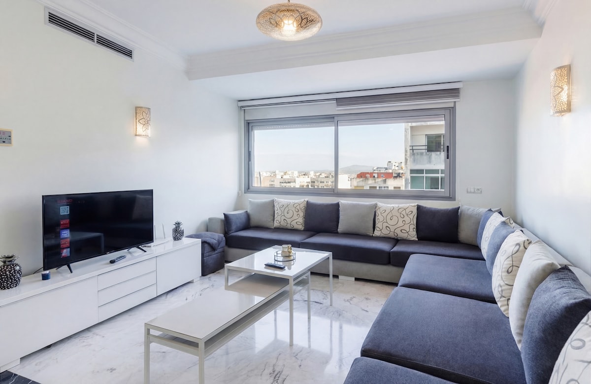 Magising sa mga Tanawin ng Karagatan! 🌊 Chic Apt sa Heart of City 📌Walang kapantay na lokasyon! Wala pang 10 minutong lakad papunta sa Medina (lumang bayan) at 10 minutong papunta sa beach Naka - istilong 100m² na may mga tanawin ng karagatan mula sa bawat kuwarto, terrace at balkonahe Central pa mapayapa. Marmol na sahig at puno ng sining Mga Amenidad: 🅿️ Paradahan, 🏊 Pool, 🔒 24/7 na Seguridad Maglakad papuntang: 🏖️ Beach – 10 minutong lakad 🏰 Medina/Kasbah – 8/15 minutong lakad ⚓ Marina Bay/Port – 10 minutong lakad 🍽️ Mga restawran, cafe, supermarket at tindahan sa ibaba 🚀 Mabilis na WIFI, 📺 2 TV, 🎬 Netflix