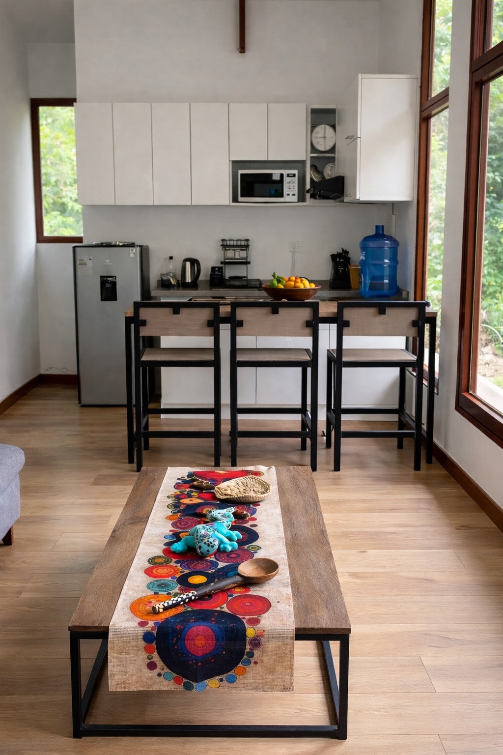 Mini Casa estilo "cabaña", acogedora y confortable, ideal para parejas y familias pequeñas con hijos, luz natural y amplios ventanales con malla mosquitera y cortinas, ventiladores en ambos pisos, una pequeña cocina comedor con cocina a gas 2 hornillas, utensilios y menaje básico para cocinar. 01 Baño con agua caliente en el primer piso. En el segundo piso 01 TV con cable, y 03 camas individuales. Rodeada de naturaleza. A 13 cuadras en línea recta de la Plaza de Tarapoto y 5 minutos en vehículo.
