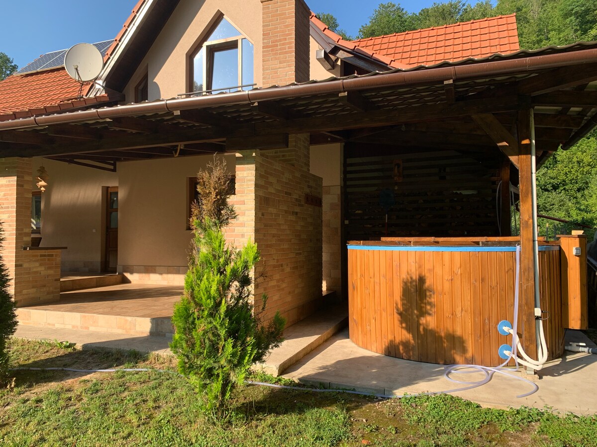 Binubuo ang bahay sa ibabang palapag ng maluwang na sala, silid - tulugan na may sariling banyo, kumpletong kusina, toilet, terrace sa labas na may barbecue at dining space, tub na may pinainit na tubig at hydromassage( ang tub na may bayad na 300 lei/isang araw o 400 lei pang araw) Sa itaas ay may 3 kuwarto na may mga dobleng higaan at ensuite na banyo bawat isa, sa 2 kuwarto ay may mga dagdag na single bed at isang kutson sa sahig ng isa sa mga kuwarto.