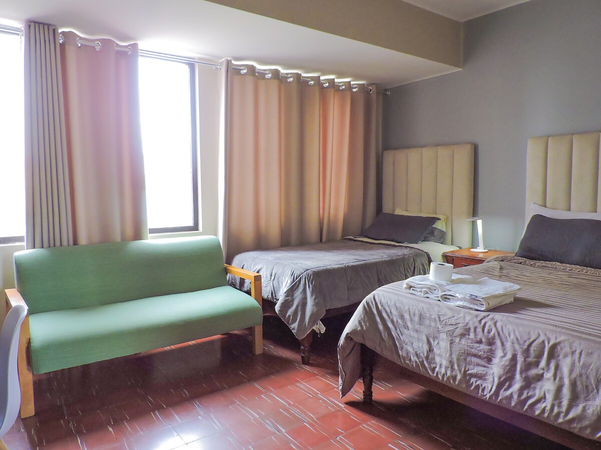¡Maligayang pagdating sa aming suite sa gitnang lugar! Ang aming bagong inayos na apartment ay may dalawang kapaligiran: kusina at silid - kainan, at isang silid - tulugan na may double bed, na may opsyon na magdagdag ng kutson sa sahig, mayroon din itong pribadong banyo at paradahan. Perpekto ang aming lokasyon, 6 na bloke kami mula sa Main Plaza, 2 bloke lang mula sa kahanga - hangang tanawin at 4 na bloke mula sa Central Market. Sana ay mag - enjoy ka sa iyong pamamalagi sa amin!