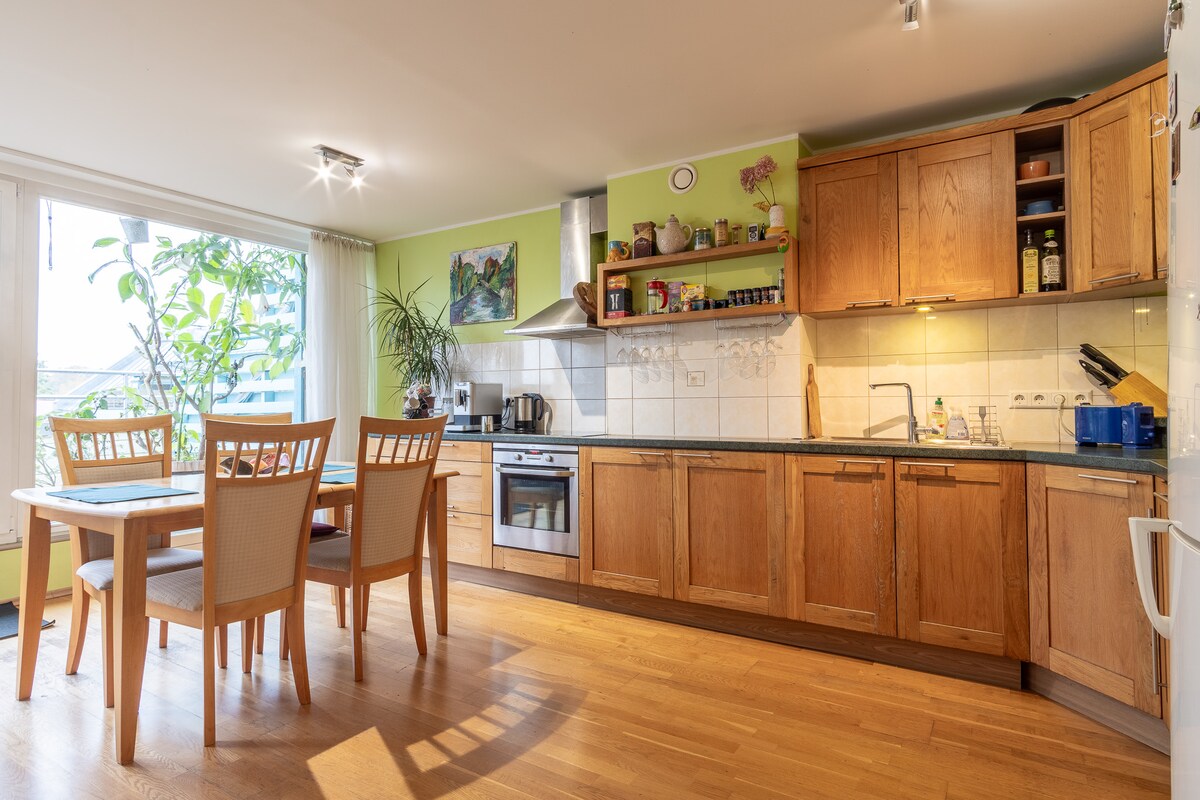 Tiyak na magugustuhan mo ang maluwang na penthouse na ito (125 m2) na may sauna, hot tub, malaking terrace, at pagong! Mga Amenidad ng Bahay: * Maluwang na sala na may open kitchen at lahat ng kagamitan sa pagluluto * Espresso machine na may mga butil ng kape * 5 minuto lang ang layo sa sentro * Mabilis na 200/200 Mbit/s internet * 55-inch OLED TV na may Netflix Premium at 59 na TV channel * 2 banyo at sauna na may front room * 3 kuwarto + 2 kuwartong angkop para sa pagtulog * Malaking terrace * Pribadong paradahan