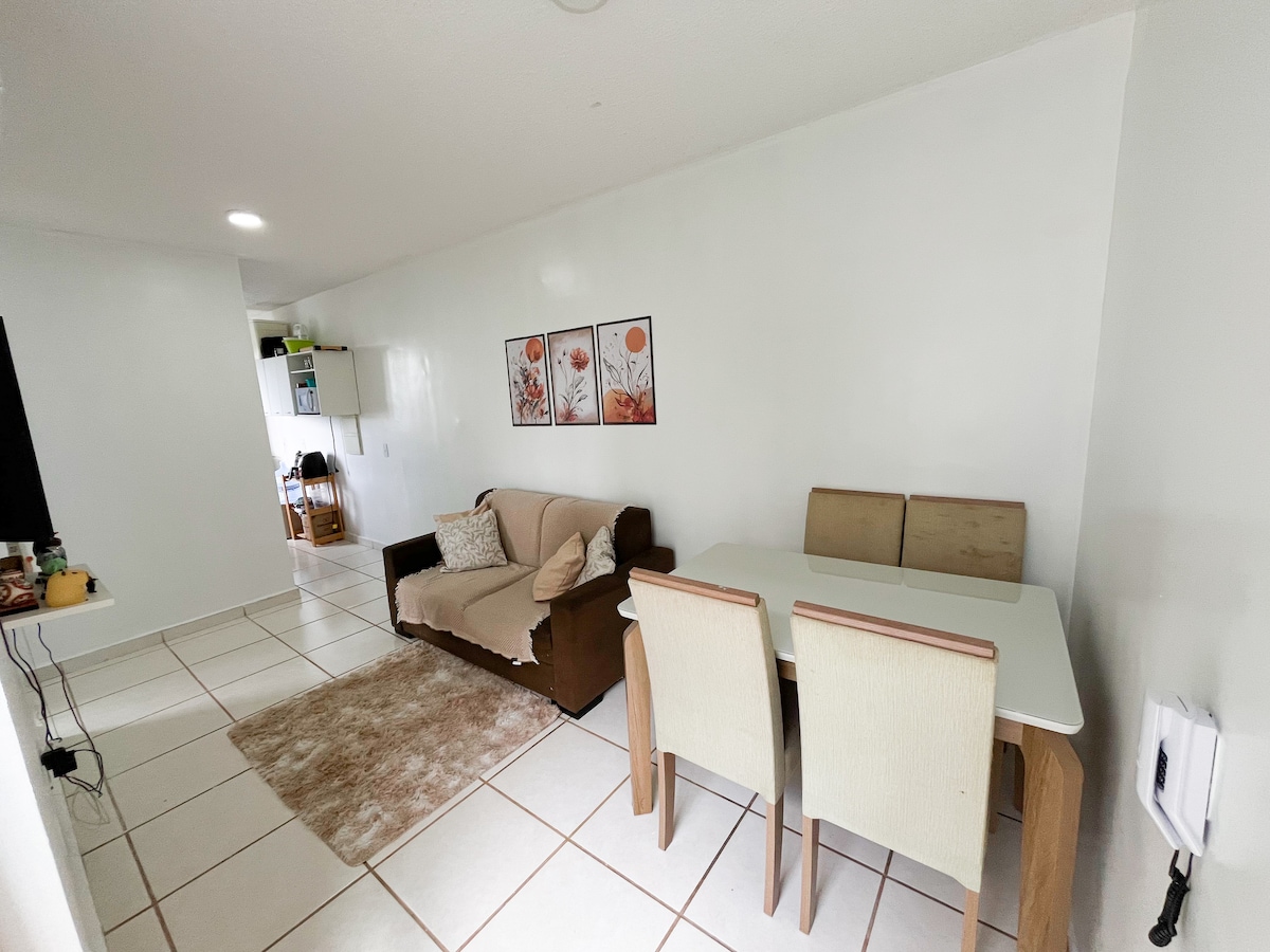 Tangkilikin ang tahimik na apartment na ito. Aconchegante at functional, perpekto para sa malayuang trabaho at pahinga ng pamilya! Mayroon itong mabilis na internet, office desk, king - size na kama, air conditioning, TV na may Netflix at Prime Video. Kuwartong may sofa bed, kumpletong kusina (kalan, refrigerator, washing machine) at banyong may de - kuryenteng shower. Perpekto para sa hanggang 4 na tao na may kaginhawaan ng tahanan. Malapit sa beauty salon, pet - shop, botika, supermarket, at restawran.