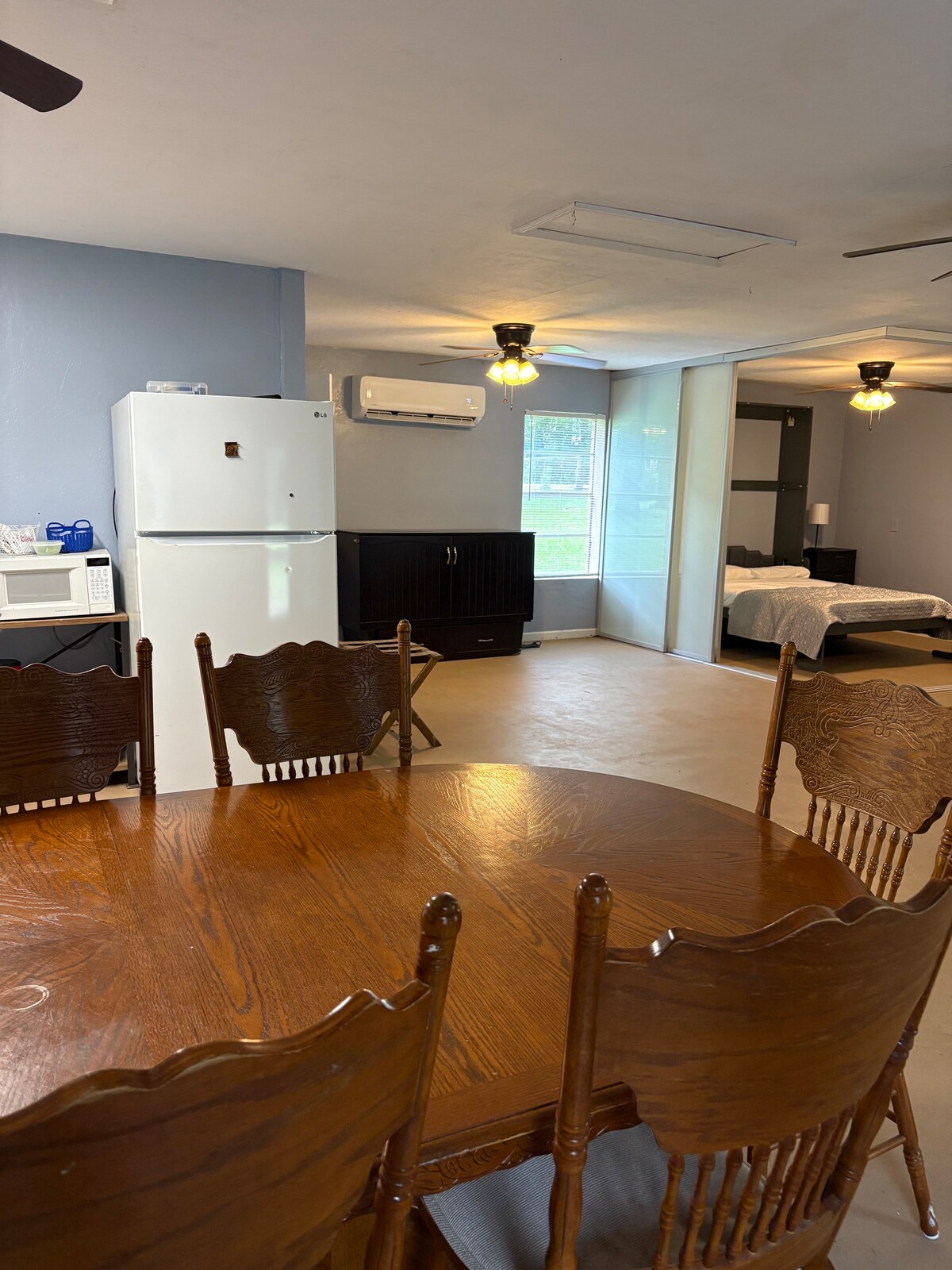 This is a 552sqft apartment within our home. It has a completely private driveway and entrance and secure locking interior door between units. One of the features we think you'll most enjoy is the spacious shower with all the hot water you could want! The kitchenette is ready for a bit of cooking if you like. In addition to the King bed, the sofa folds into a bed suitable for an older child or young adult, and a twin mattress on the floor is available upon request.