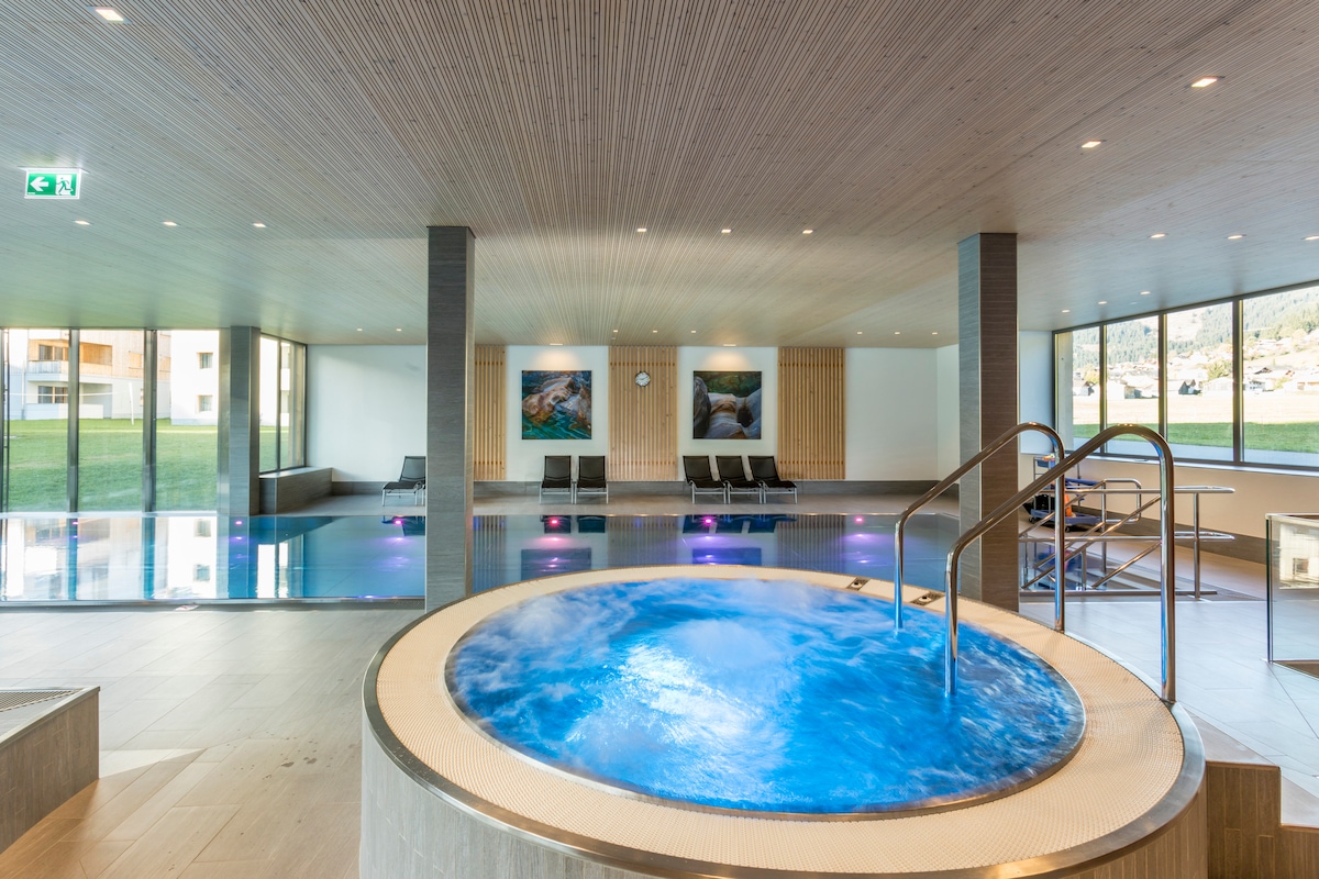 Magrelaks sa natatanging Rifugio na ito. Noong 2020, ganap na naayos ang 2 1/2 room apartment, na ang panloob na disenyo ay ganap na muling idinisenyo. Itinayo bilang isang loft na may pinakamasasarap na materyales (Valser Granit, castle parquet, maraming vintage wood, freestanding tub, iron fireplace na bukas sa dalawang panig, mga fixture ng disenyo). May protektadong pag - upo sa hardin at hardin. Maaraw, tahimik na lokasyon. Pribadong pasukan ng bahay, sauna sa annex. Mapupuntahan ang ski in, ski out o ski bus sa loob ng tatlong minuto.