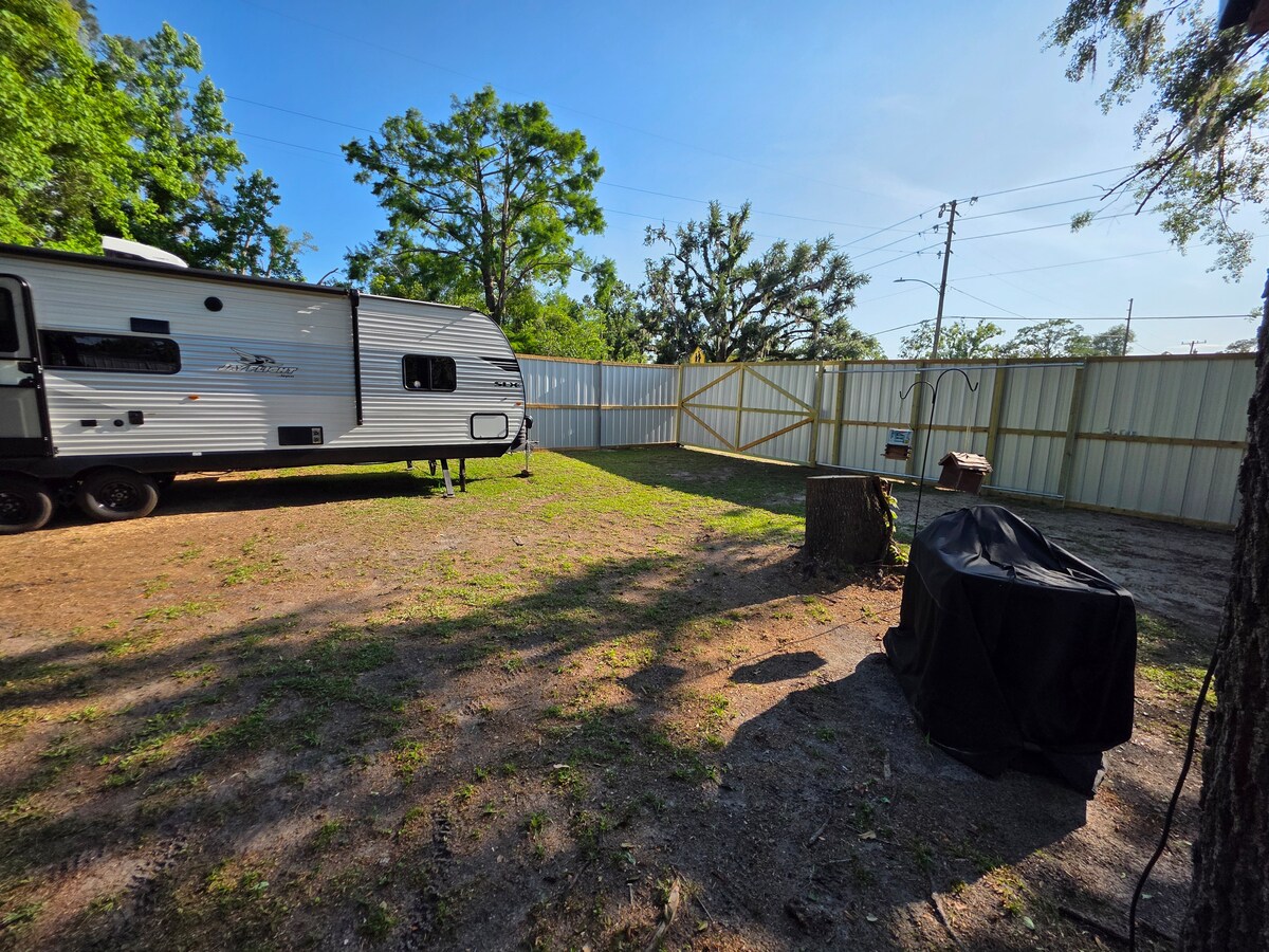 In the heart of Steinhatchee! Outdoor kitchen, large firepit, screened in porch. Ms. Annie features a full size refrigerator. Electric water heater. Amazing A/C! Within walking or golf cart ride to all restaurants, shopping,piers and boat rentals,marinas, 35 -55mins to beautiful springs(ginnie,itchitucknee,Hart, Fanning). Parking for boat trailers. Covered Hammock area for relaxing. String lighting throughout for ambience. Also have a camper that sleeps 8 on site for groups/families