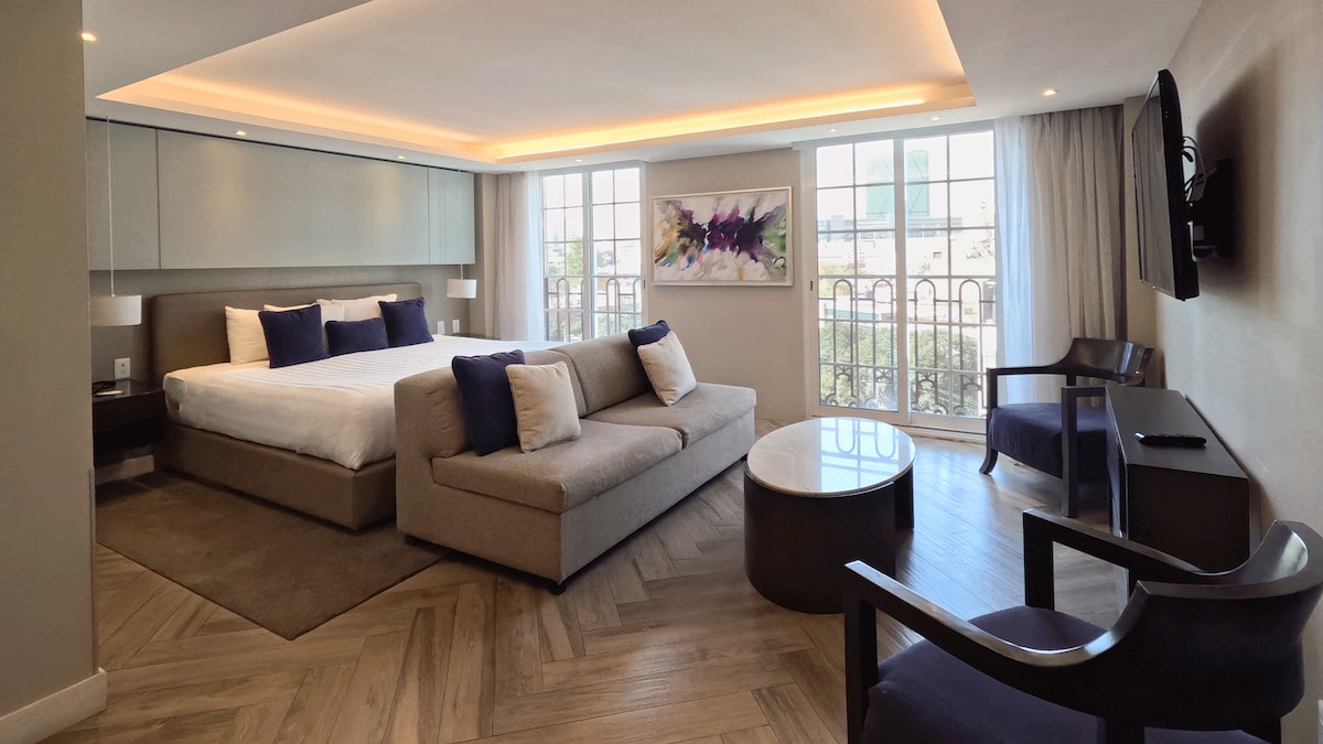 Dalawang suite, malawak na kusina, at sala na may sofa bed. May mga bintanang mula sahig hanggang kisame ang mga suite na ito na may magandang tanawin ng Reforma Avenue, mula sa mga pagsikat ng araw at dagat ng ulap hanggang sa mga tanawin ng lungsod sa gabi. • Pangunahing lokasyon sa downtown: 5 minutong lakad papunta sa metro station papunta sa distrito ng pananalapi ng Reforma, 20 minuto papunta sa airport. • Napakabilis na Wi‑Fi at komportableng workspace, malapit sa business center/cafe.