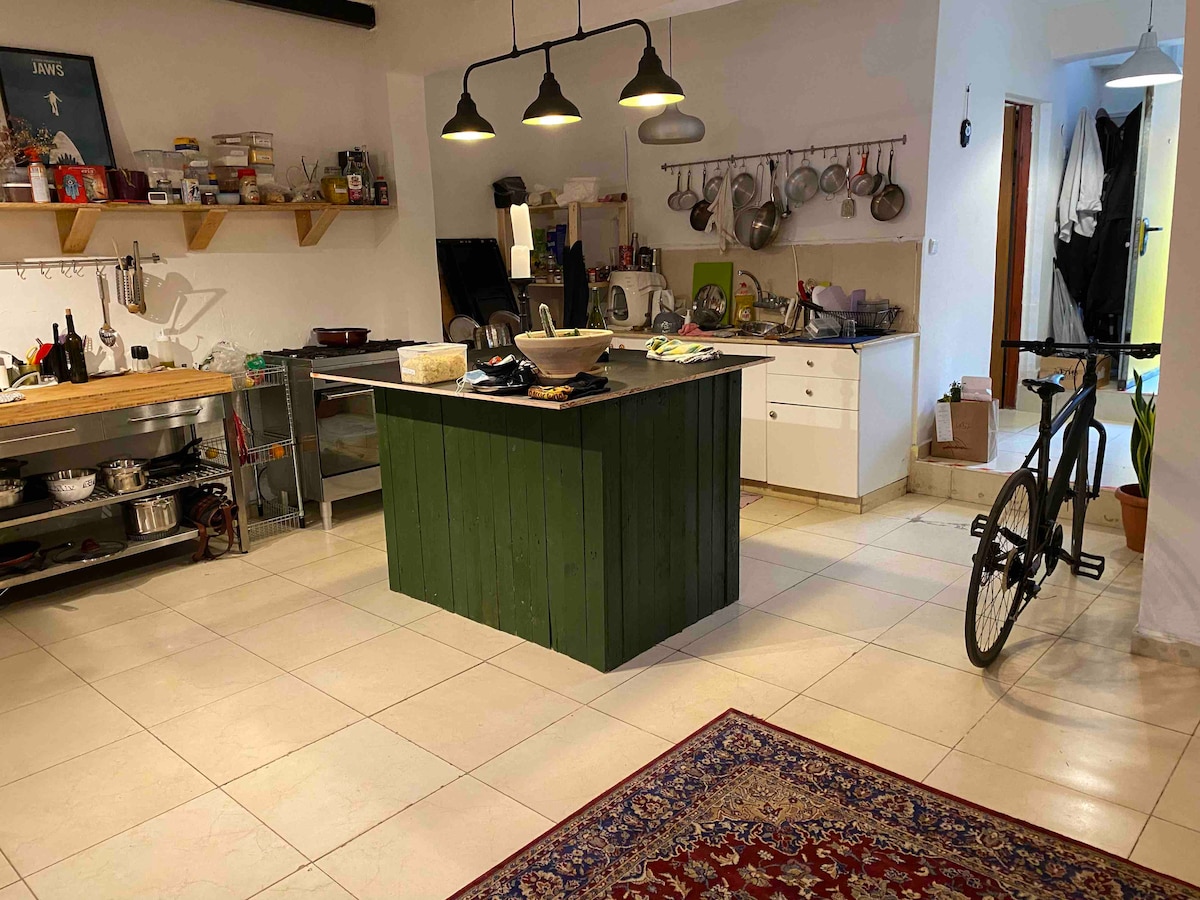Dalawang kuwarto sa kama, dalawang kuwarto sa paliguan sa dalawang palapag. Mahusay na dekorasyon na may mga kisame na higit sa anim na metro ang taas, apat na terrace na nakaharap sa lahat ng direksyon, ang mga double glazed window at makapal na stone masonry ay magbibigay sa iyo ng puwang sa paghinga, pag - ibig at kapayapaan na nararapat sa iyo sa iyong bakasyon. Sa unang palapag 90 sq.meters kasama ang dalawang balkonahe at isang entrance flight na maaari mong gamitin bilang iyong ikatlong balkonahe, na napapalibutan ng hardin ng bulaklak na kung saan ay din ang hagdanan sa loft. Sa sahig na ito matutulog, magluluto, maglilibang sa mga araw ng tag - init at magtatrabaho sa iyong pribadong opisina. Sa ikalawang palapag, 40 sq.meters ang lapad ay mapapanood mo ang Tv sa bukas na espasyo ng gallery, ang isa pang dalawang bisita ay matutulog sa romantikong attic room na ito at lahat kayo ay maglalaan ng oras na magkasama sa sun roof terrace upang tamasahin ang Mediterranean sun kahit na sa taglamig. Ang buong lugar ay magagamit mo. At marami nito. Ang mga aparador ng silid - tulugan at ang mga drawer ng attic room (kung ikaw ay higit sa 2) ay magagamit mo. Maaari mong itabi ang iyong mga bagahe sa opisina, sa tabi ng pasukan, sa malapit na pag - abot at wala sa paningin Magiliw kang hino - host (sa Ingles at Pranses) ni Alina, ang aming malihis na anak na babae. Makakakuha ka ng maraming impormasyon tungkol sa mga hangout sa malapit at sa mas malawak na lugar ng Tel Aviv tulad ng sa buong Israel. Ang loft ay nasa isang gitnang lugar ng Jaffa, kung saan nagsisimula ang Greek Market. Ito ay isang lugar ng mga restawran at bar na puno ng mga tao, isang artisan market, at isang flea market. 4 na minutong lakad ang beach, at 15 minuto ang layo ng lumang daungan ng Jaffa habang naglalakad. Transportasyon matalino ang kapitbahayan na ito ay nakaupo sa tabi mismo ng isang intercity hub nang hindi nagbabayad para sa mga ito na may presyo ng kapayapaan at katahimikan na kilala para sa. dalawang min. lakad at ikaw ay nasa buss stop sa Tel Aviv center, railway & buss station sa lahat ng Israel, Bat Yam, Holon at higit pa. Maaari mong gamitin ang aming mga bisikleta na nakatalaga sa ibaba ng hagdanan. Sumakay sa Jaffa port sa arr. 8 sa umaga, bumili ng ilang isda mula sa mga mangingisda sa mga dock. Mag - enjoy !. Hindi mo kailangang mag - alala tungkol sa mga halaman na dinidilig ng isang awtomatikong dripping system (well, marahil sa loob at sa harap na balkonahe. Kung gusto mong maramdaman na nasa bahay ka lang). May coffee machine, gatas, at water bar kaya hindi mo kailangang mag - alala tungkol doon kapag bumangon ka. Mga grocery at tindahan sa paligid ng block, 24/7. Makakakuha ka ng mga direksyon para sa lahat.