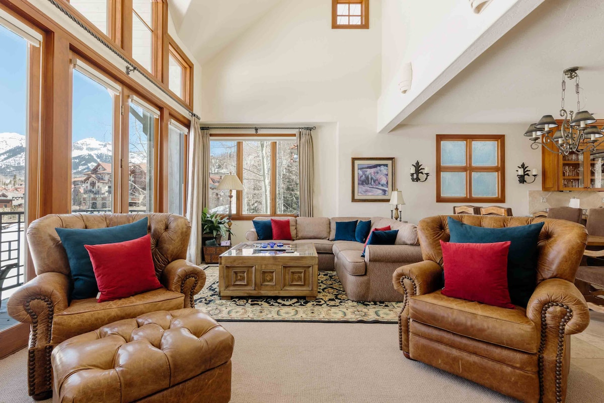 Matatagpuan ang West End Retreat sa pagitan ng base ng Telluride ski area at mga bangko ng San Miguel River. Ang liwanag at maliwanag na 2 bdrm. /2.5 bath condo (1 Q & 2 TWNS) na ito ay naglalagay sa lahat ng Telluride sa loob ng mga hakbang mula sa iyong pinto sa harap! Matatagpuan sa mahigit tatlong palapag, nagbibigay ang condo na ito ng espasyo para makihalubilo sa isang vaulted na sala at kumpletong kusina na may fireplace at pribadong katabing balkonahe. May on - site hot tub na may mga tanawin ng ski area para sa iyong mga paglalakbay sa post mountain!