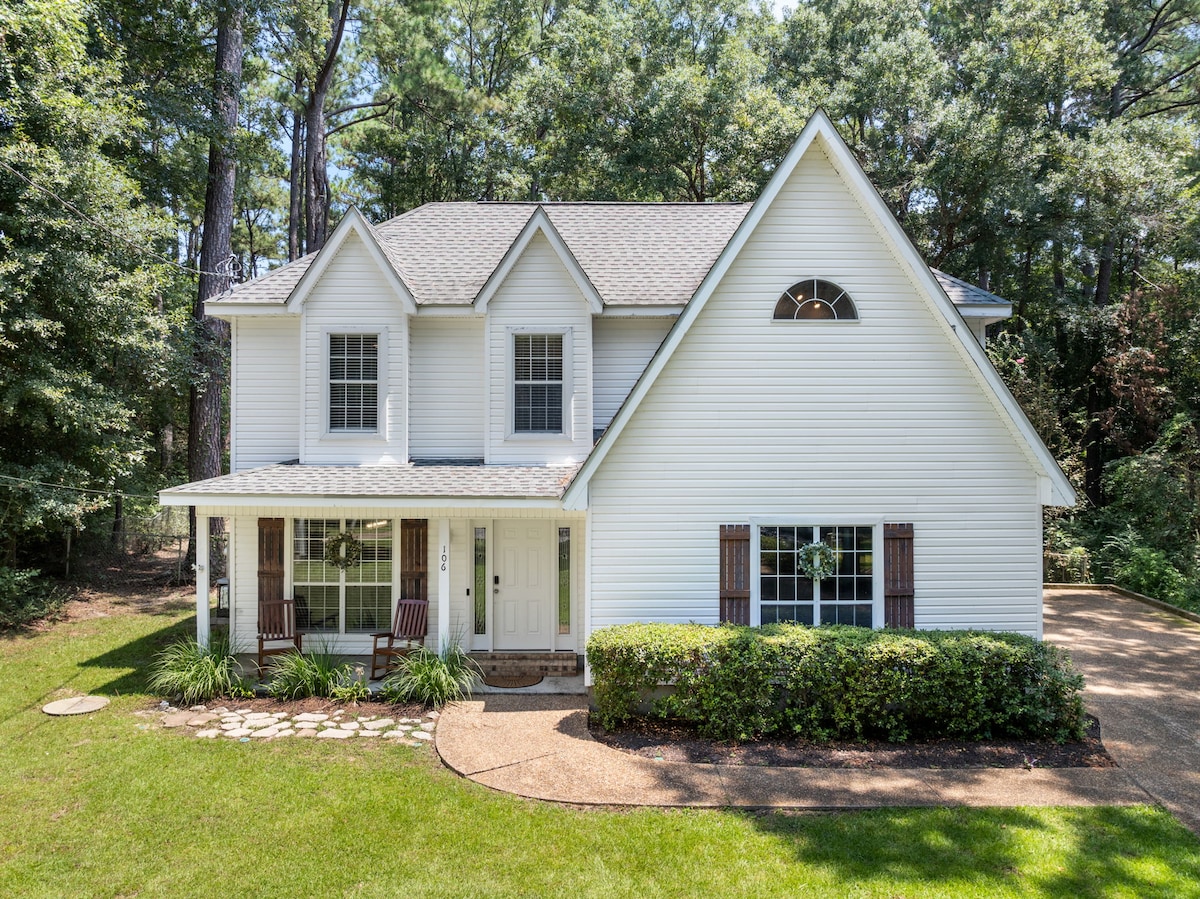 Magrelaks sa maliwanag na bahay na may 4 na higaan at 2 banyo sa Daphne na may mga vaulted ceiling at istilong baybayin, na kayang tumanggap ng 10 bisita. Prime spot: 5 min sa I-10, 5 min sa Mobile Bay ~ mabilis na biyahe sa mga beach, Mobile & Fairhope. Mag‑enjoy sa malawak na sala, kumpletong kusina, at may screen na balkonahe. King master + 3 queen room (2 queen sa isa) 5 higaan ✔️May Screen na Balkonahe ✔️4 na Smart TV ✔️ WiFi ✔️Washer/dryer at sapat na paradahan ✔️Tahimik na kapitbahayan Sariling pag-check in, pampamilya, walang usok. Mag-book na!
