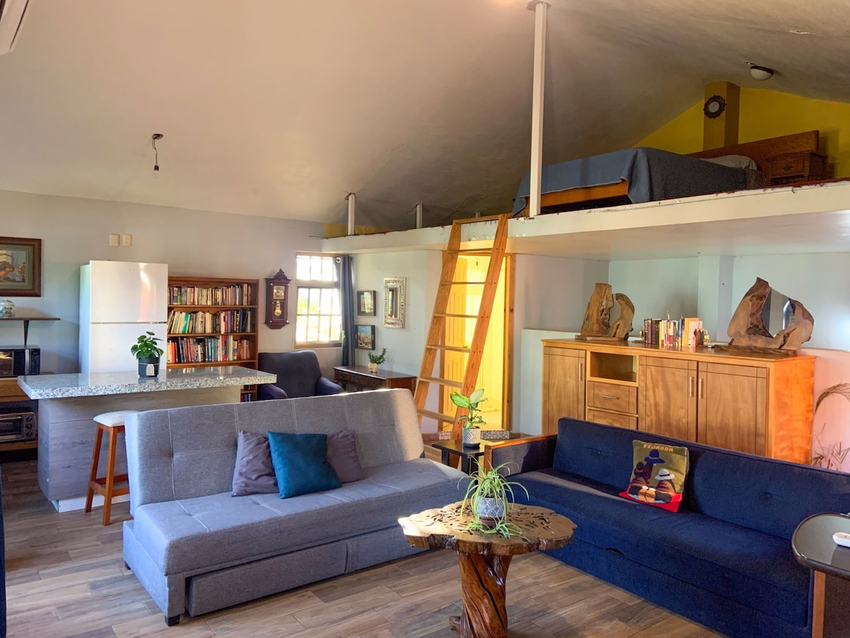 Espacio bohemio con estacionamiento, jardín, terraza, área de fogata, rodeado de árboles frutales, tele con Roku, internet de alta velocidad, cocina súper equipada, cortinas black out, espacio para trabajar y la mejor experiencia para dormir en un tapanco en la parte de arriba. Aire acondicionado y dos sillones cama extra para albergar hasta 4 personas. Colonia tranquila al lado del río, a 10 min en auto del centro de la ciudad, a 8 de la central de autobuses y a 6 del palenque de feria tepabril